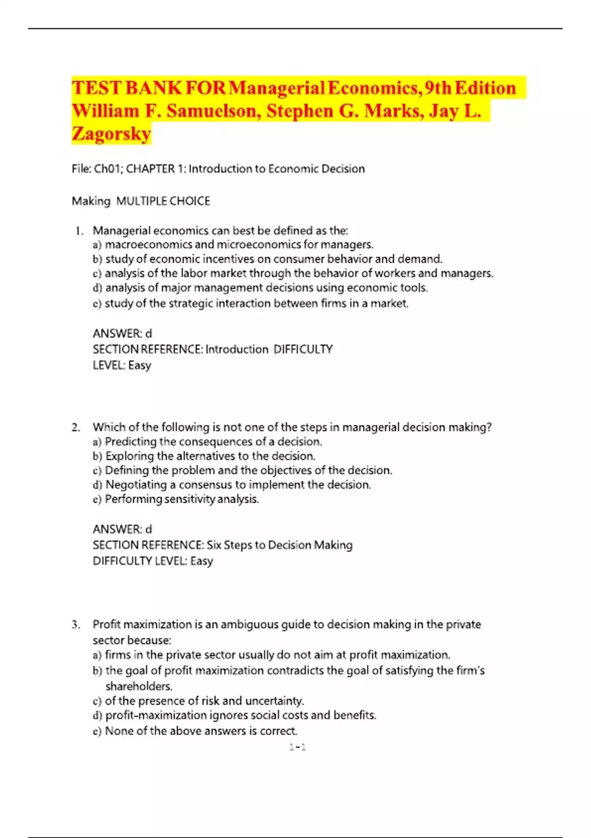 TEST BANK FOR Managerial Economics, 9th Edition By William F. Samuelson, Stephen G. Marks, Jay L. Zagorsky |All Chapters | Latest Version 2025 A+