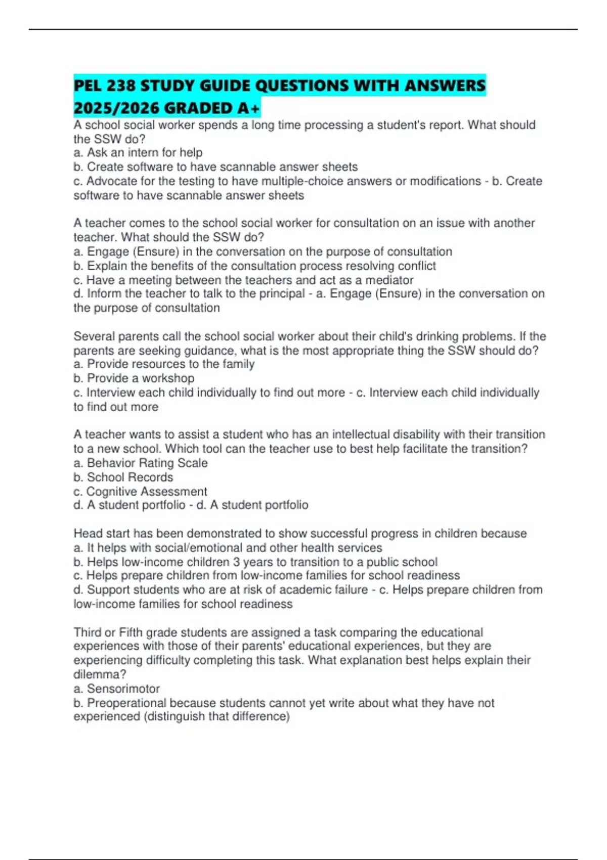 PEL 238 STUDY GUIDE QUESTIONS WITH ANSWERS 2025/2026 GRADED A+ A school social worker spends a long time processing a student's report. What should the SSW do? a. Ask an intern for help b. Create software to have scannable answer sheets c. Advocate for the testing to have multiple-choice answers or modifications - b. Create software to have scannable answer sheets A teacher comes to the school social worker for consultation on an issue with another teacher. What should the SSW do? a. Engage (Ensure) in the conversation on the purpose of consultation b. Explain the benefits of the consultation process resolving conflict c. Have a meeting between the teachers and act as a mediator d. Inform the teacher to talk to the principal - a. Engage (Ensure) in the conversation on the purpose of consultation Several parents call the school social worker about their child's drinking problems. If the parents are seeking guidance, what is the most appropriate thing the SSW should do? a. Provide resources to the family b. Provide a workshop c. Interview each child individually to find out more - c. Interview each child individually to find out more