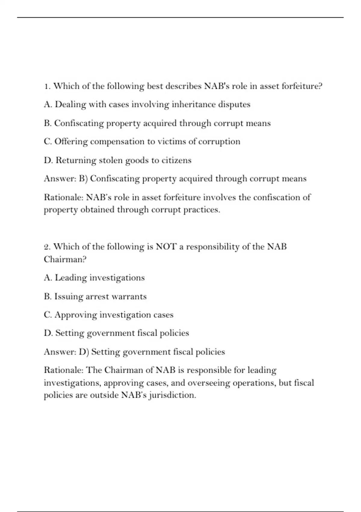 Rationale: NAB’s role in asset forfeiture involves the confiscation of