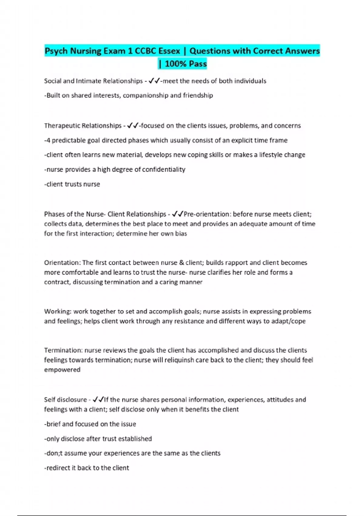 Psych Nursing Exam 1 CCBC Essex | Questions with Correct Answers | 100% Pass