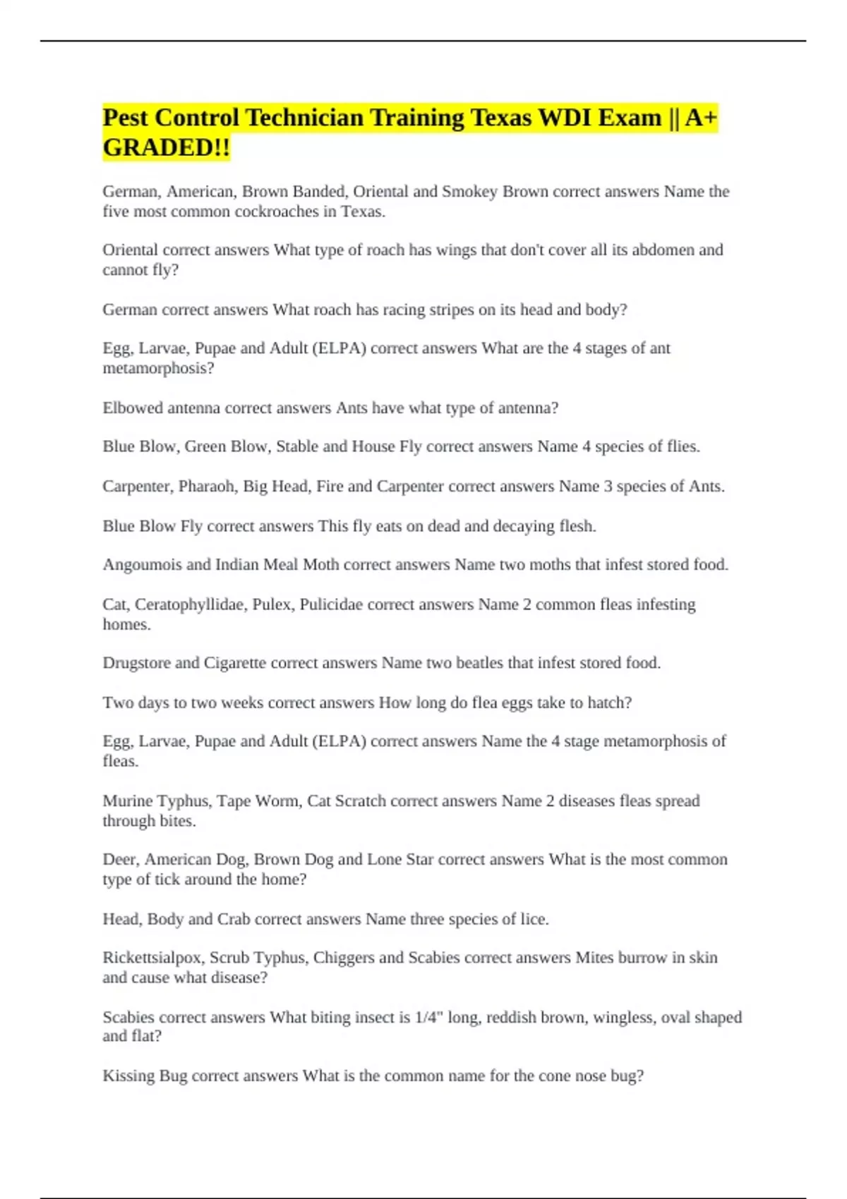 Scabies correct answers What biting insect is 1/4" long, reddish brown, wingless, oval shaped