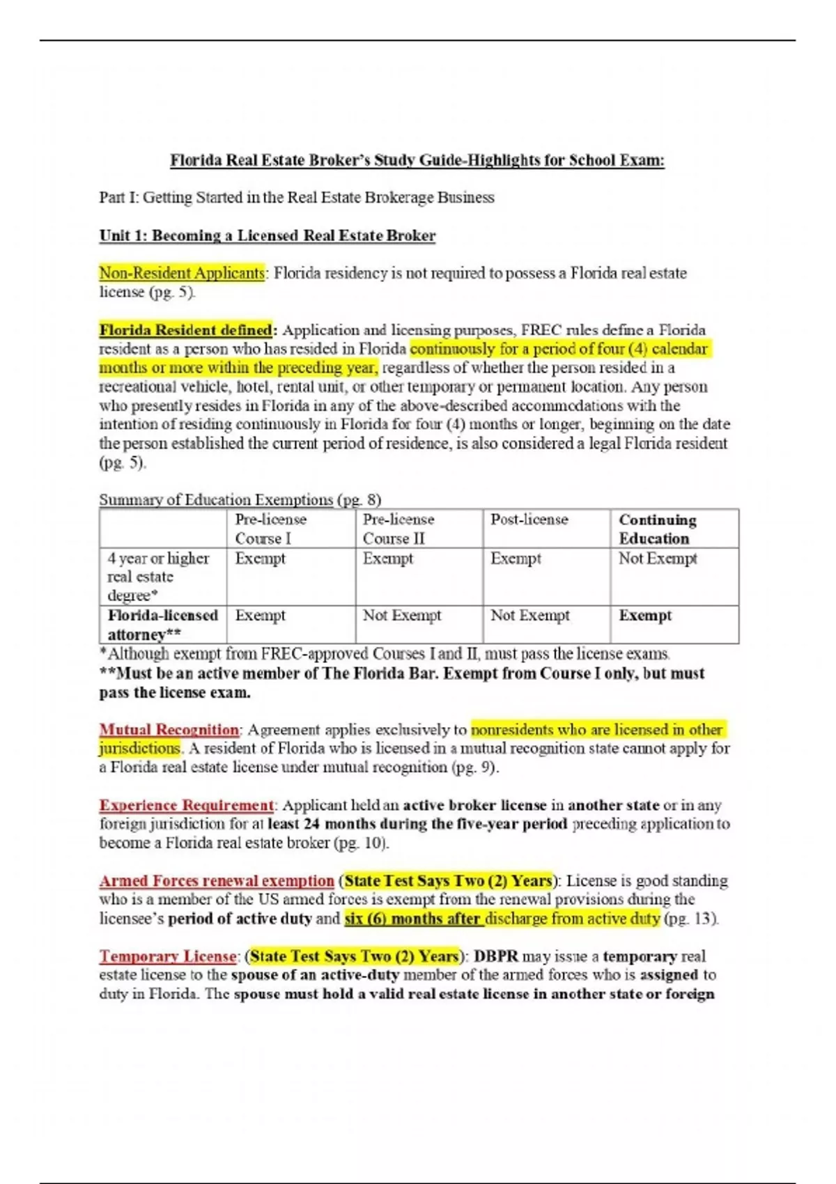 Florida Real Estate Broker’s Study Guide-Highlights for School Exam:2025 Update with complete solution