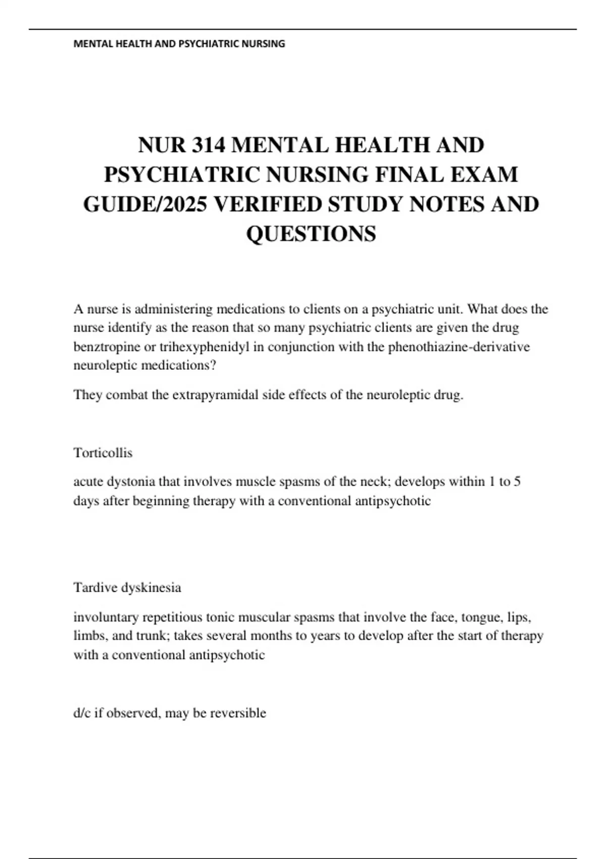 NUR 314 MENTAL HEALTH AND PSYCHIATRIC NURSING FINAL EXAM GUIDE/2025 VERIFIED STUDY NOTES AND QUESTIONS