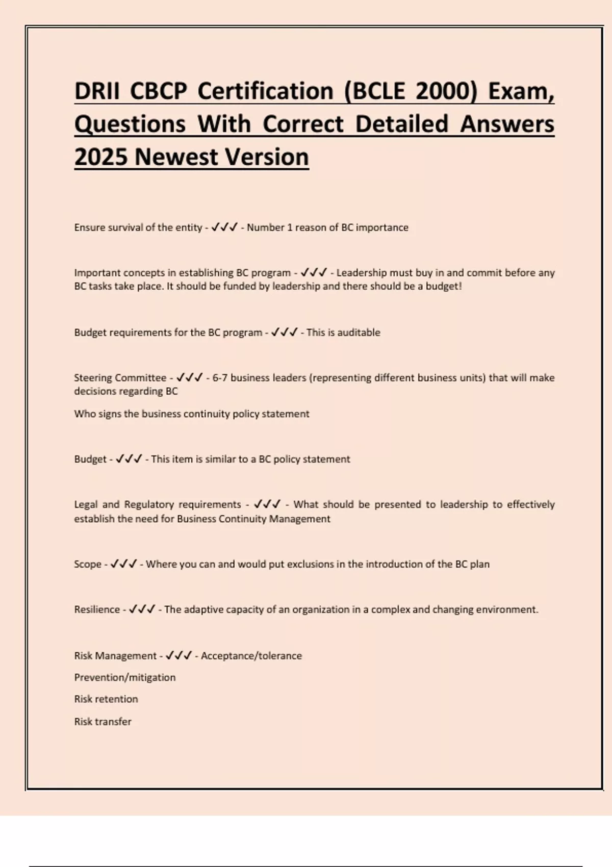 Important concepts in establishing BC program - ✔✔✔ - Leadership must buy in and commit before any