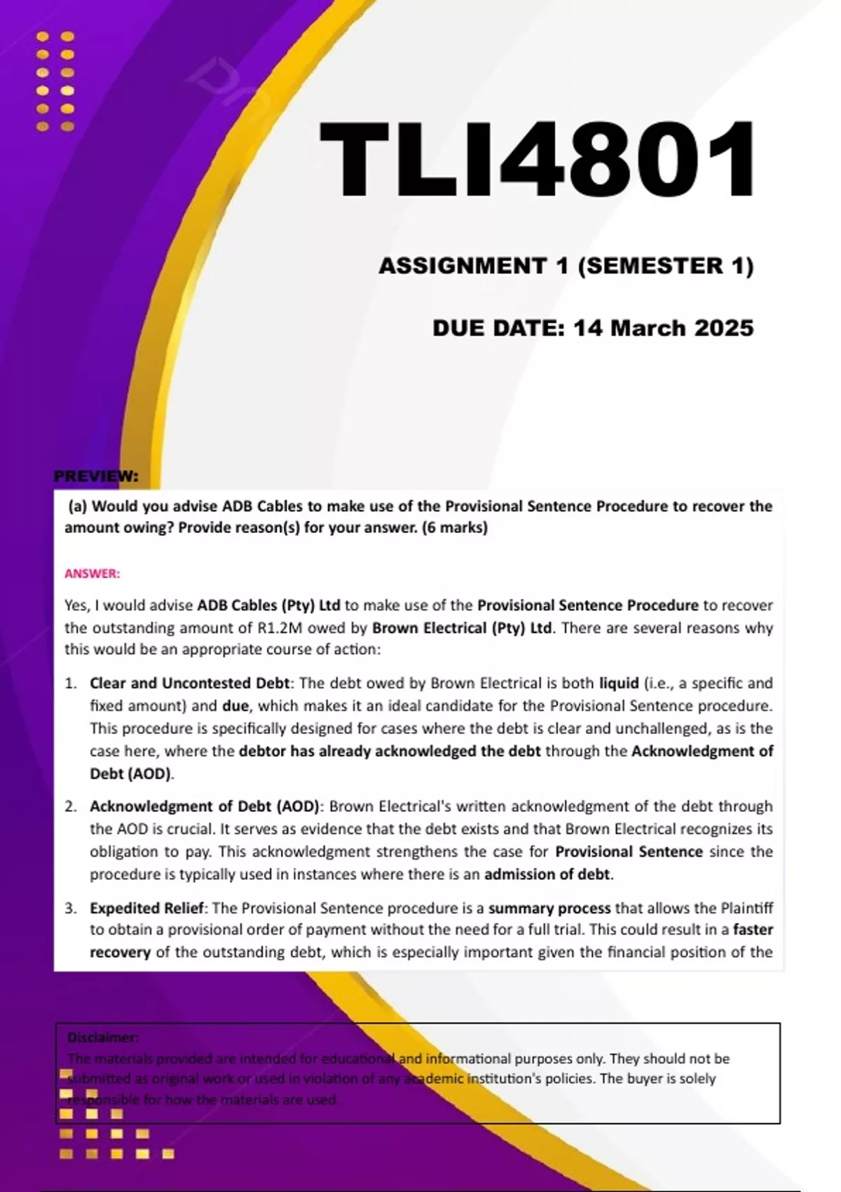 (a) Would you advise ADB Cables to make use of the Provisional Sentence Procedure to recover the