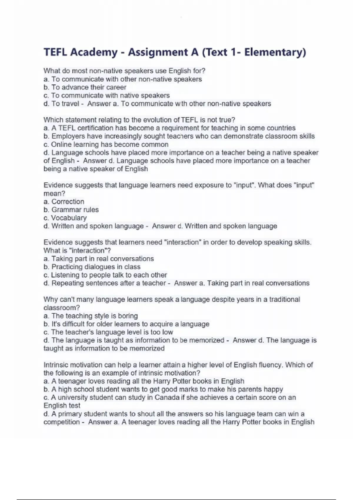 TEFL Academy - Assignment A (Text 1- Elementary) What do most non-native speakers use English for? a. To communicate with other non-native speakers b. To advance their career c. To communicate with native speakers d. To travel - Answer a. To communicate with other non-native speakers Which statement relating to the evolution of TEFL is not true? a. A TEFL certification has become a requirement for teaching in some countries b. Employers have increasingly sought teachers who can demonstrate classroom skills c. Online learning has become common d. Language schools have placed more importance on a teacher being a native speaker of English - Answer d. Language schools have placed more importance on a teacher being a native speaker of English Evidence suggests that language learners need exposure to "input". What does "input" mean? a. Correction b. Grammar rules c. Vocabulary d. Written and spoken language - Answer d. Written and spoken language Evidence suggests that learners need "interaction" in order to develop speaking skills. What is "interaction"? a. Taking part in real conversations b. Practicing dialogues in class c. Listening to people talk to each other d. Repeating sentences after a teacher - Answer a. Taking part in real conversations Why can't many language learners speak a language despite years in a traditional classroom? a. The teaching style is boring b. It's difficult for older learners to acquire a language c. The teacher's language level is too low d. The language is taught as information to be memorized - Answer d. The language is taught as information to be memorized Intrinsic motivation can help a learner attain a higher level of English fluency. Which of the following is an example of intrinsic motivation? a. A teenager loves reading all the Harry Potter books in English b. A high school student wants to get good marks to make his parents happy c. A university student can study in Canada if she achieves a certain score on an English test d. A primary student wants to shout all the answers so his language team can win a competition - Answer a. A teenager loves reading all the Harry Potter books in English