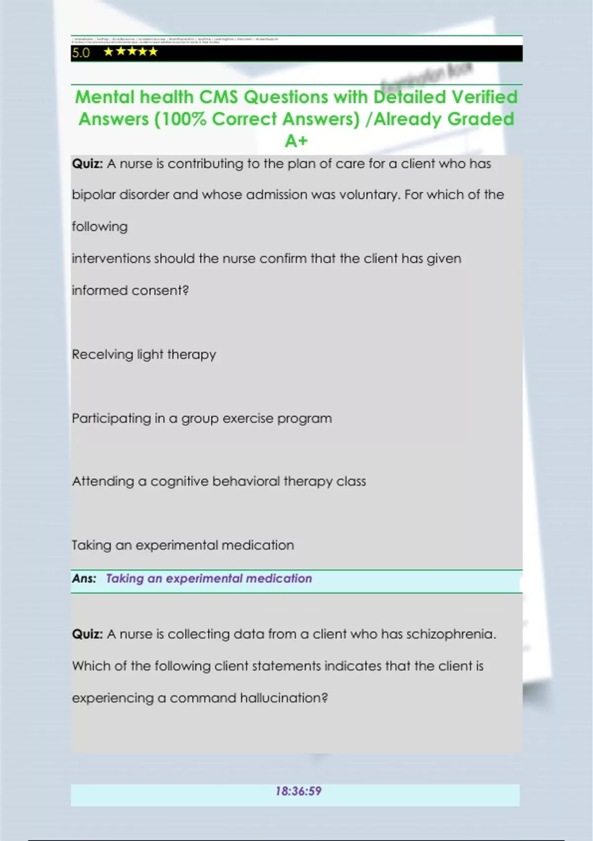 Quiz: A nurse is contributing to the plan of care for a client who has bipolar disorder and whose admission was voluntary. For which of the following interventions should the nurse confirm that the client has given informed consent? Recelving light therapy Participating in a group exercise program Attending a cognitive behavioral therapy class Taking an experimental medication Ans: Taking an experimental medication Quiz: A nurse is collecting data from a client who has schizophrenia. Which of the following client statements indicates that the client is experiencing a command hallucination? Examstudy - Stuvia US Can you see these spiders crawling all over me?' "Are you planning to kill me?" The aliens are going to abduct me tonight." "The voices told me to quit eating the food here." Ans: "The voices told me to quit eating the food here." Quiz: A nurse is speaking with the sibling of a client who refuses to see visitors. Which of the following actions should the nurse take? Arrange for the sibling to visit the client in the dayroom. Refer the sibling to the client's provider. Encourage the client to visit with the sibling. Tell the sibling the client does not want visitors. Ans: Tell the sibling the client does not want visitors. Examstudy - Stuvia US Quiz: A nurse is reviewing the laboratory results of a client who has anorexia nervosa. Which of the following results should the nurse report to the provider? Potassium 2.8 mEg/L WBC count 6,000/m