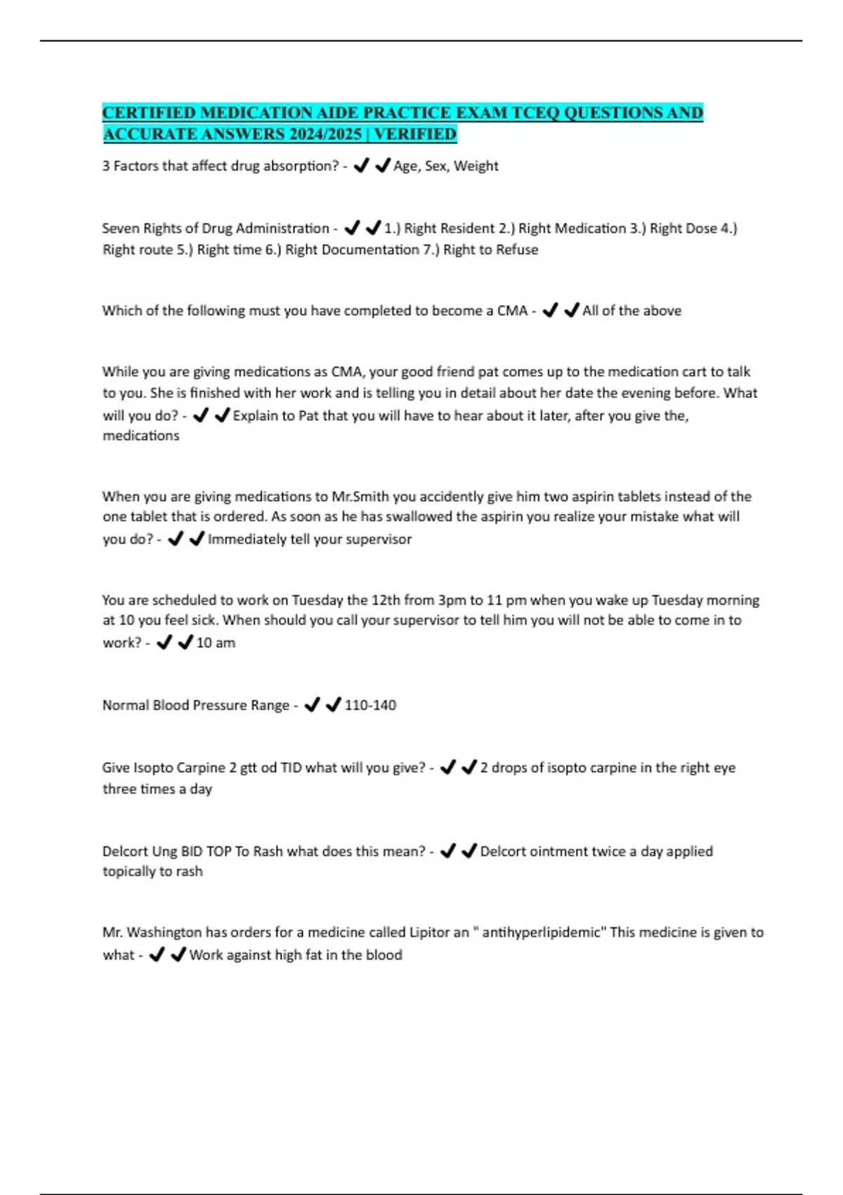 CERTIFIED MEDICATION AIDE PRACTICE EXAM TCEQ QUESTIONS AND ACCURATE ANSWERS 2024/2025 | VERIFIED