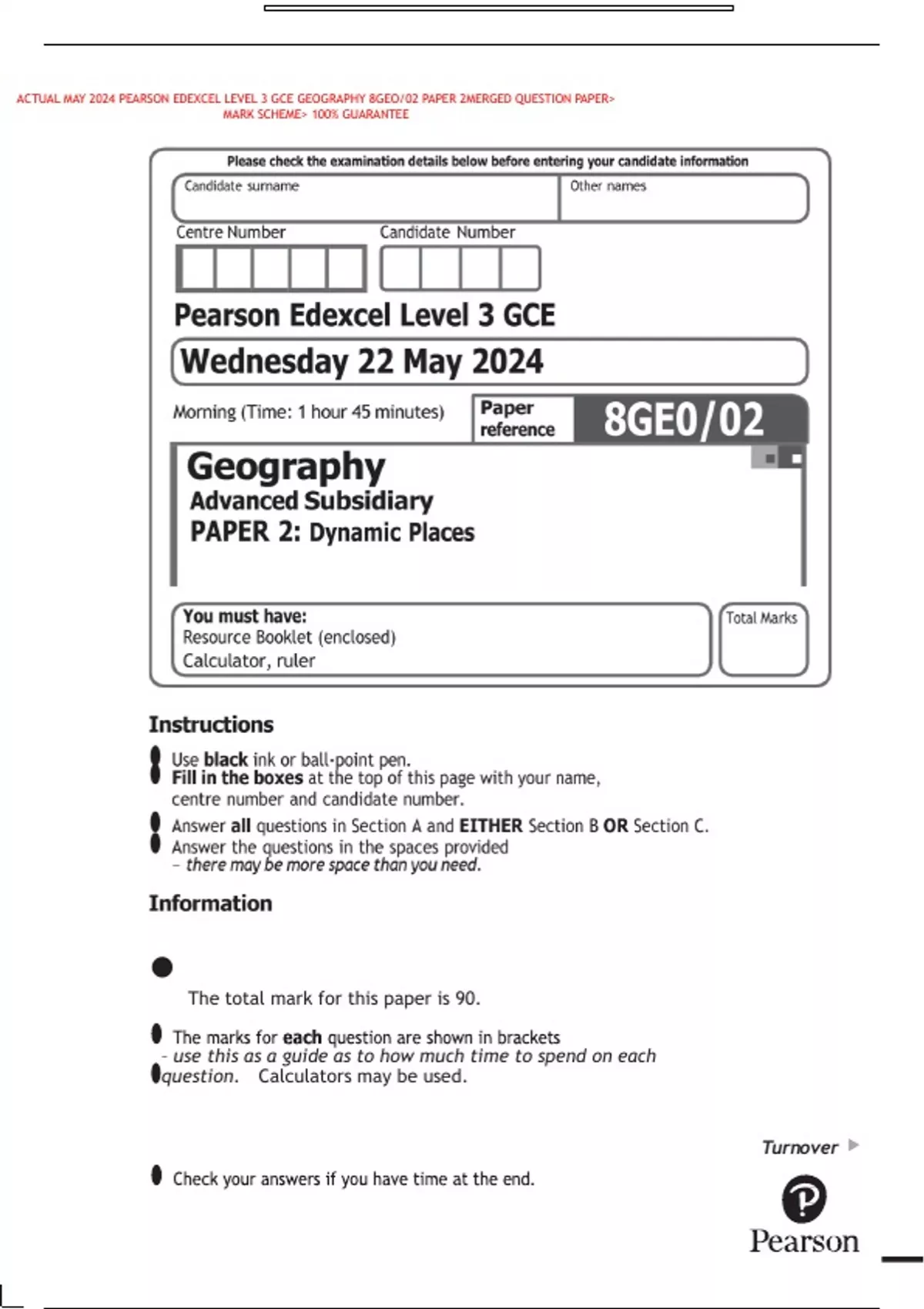 ACTUAL MAY 2024 PEARSON EDEXCEL LEVEL 3 GCE GEOGRAPHY 8GEO/02 PAPER 2MERGED QUESTION PAPER>