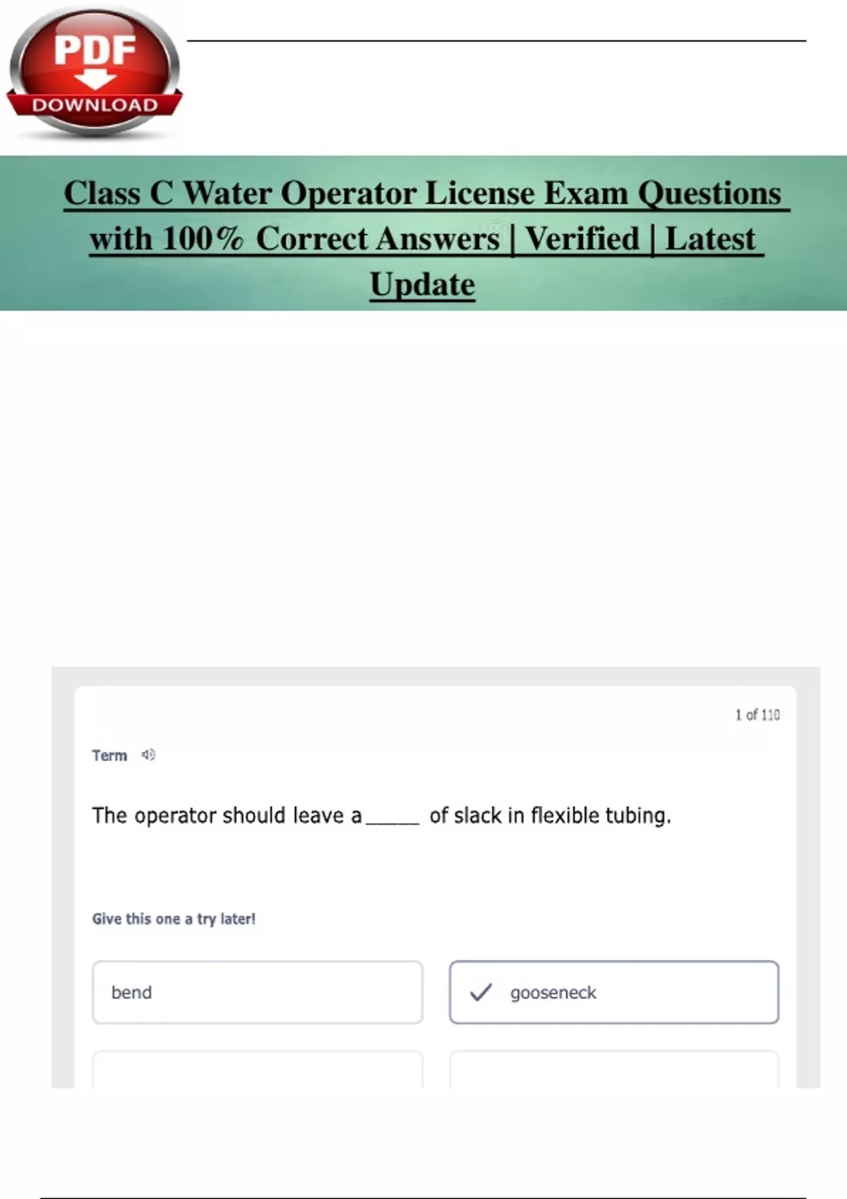 Class C Water Operator License Exam Questions with 100% Correct Answers | Verified | Latest Update