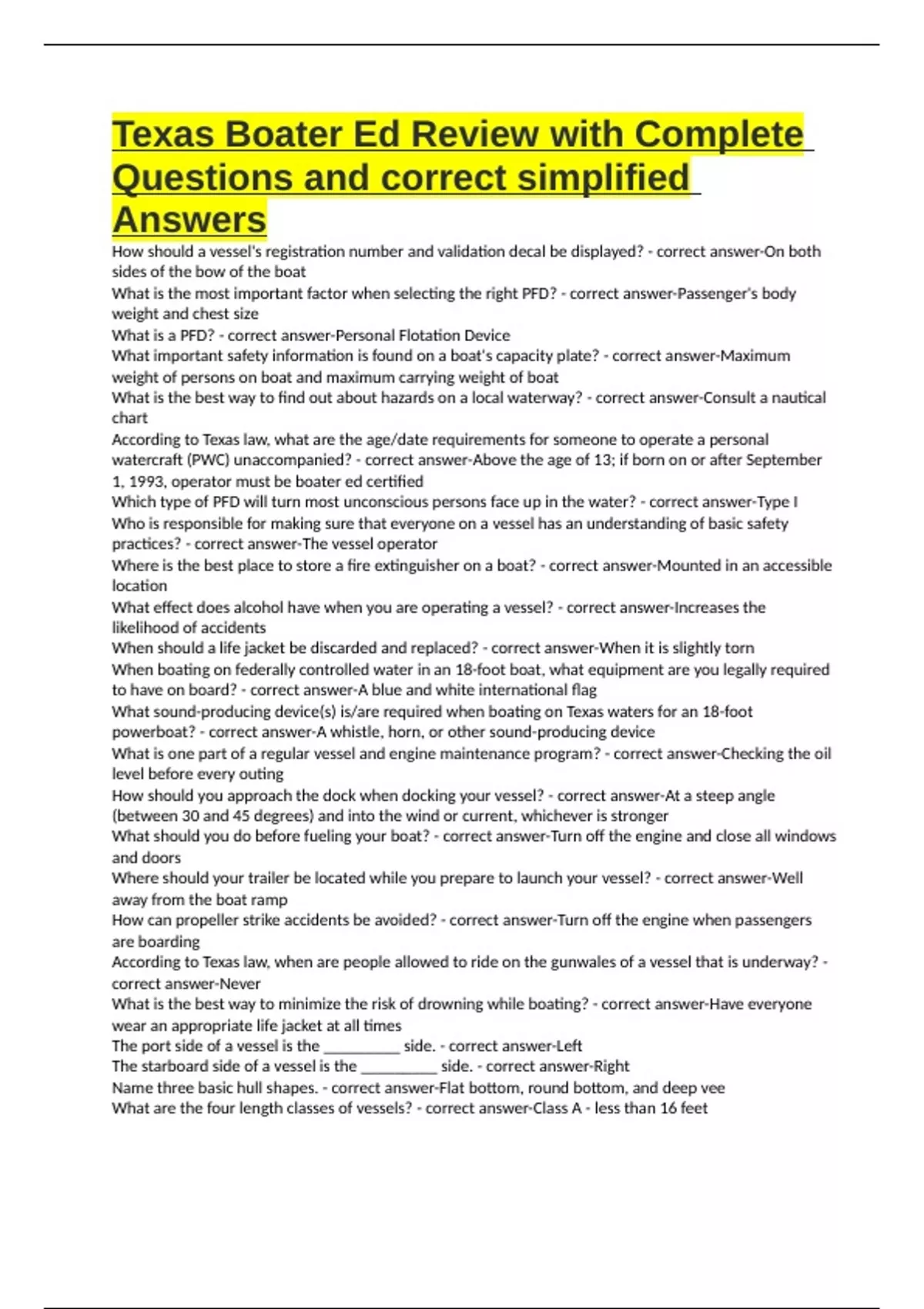 Texas Boater Ed Review with Complete Questions and correct simplified Answers
