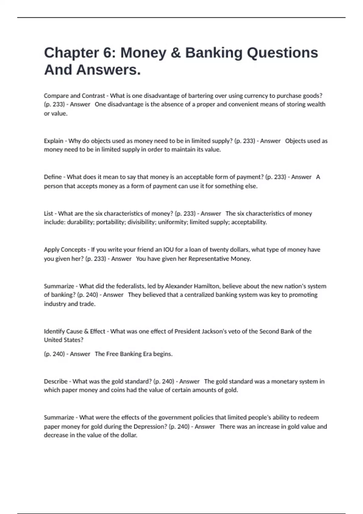 Compare and Contrast - What is one disadvantage of bartering over using currency to purchase goods? (p. 233) - Answer One disadvantage is the absence of a proper and convenient means of storing wealth or value. Explain - Why do objects used as money need to be in limited supply? (p. 233) - Answer Objects used as money need to be in limited supply in order to maintain its value. Define - What does it mean to say that money is an acceptable form of payment? (p. 233) - Answer A person that accepts money as a form of payment can use it for something else. List - What are the six characteristics of money? (p. 233) - Answer The six characteristics of money include: durability; portability; divisibility; uniformity; limited supply; acceptability. Apply Concepts - If you write your friend an IOU for a loan of twenty dollars, what type of money have you given her? (p. 233) - Answer You have given her Representative Money. Summarize - What did the federalists, led by Alexander Hamilton, believe about the new nation's system of banking? (p. 240) - Answer They believed that a centralized banking system was key to promoting industry and trade. Identify Cause & Effect - What was one effect of President Jackson's veto of the Second Bank of the United States? (p. 240) - Answer The Free Banking Era begins. Describe - What was the gold standard? (p. 240) - Answer The gold standard was a monetary system in which paper money and coins had the value of certain amounts of gold. Summarize - What were the effects of the government policies that limited people's ability to redeem paper money for gold during the Depression? (p. 240) - Answer There was an increase in gold value and decrease in the value of the dollar.