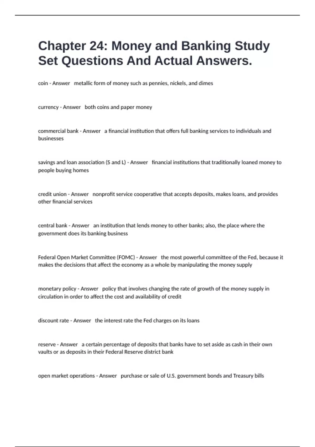 Chapter 24: Money and Banking Study Set Questions And Actual Answers.