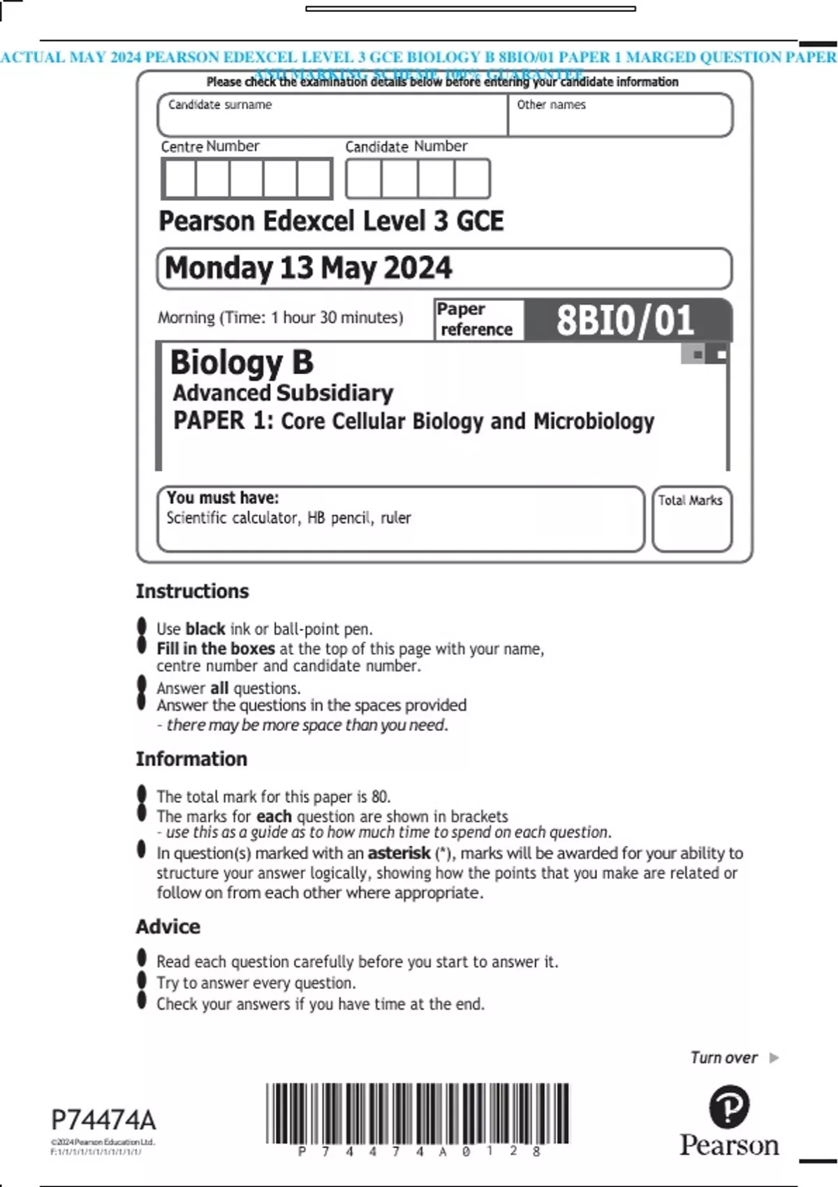 ACTUAL MAY 2024 PEARSON EDEXCEL LEVEL 3 GCE BIOLOGY B 8BIO/01 PAPER 1 MARGED QUESTION PAPER