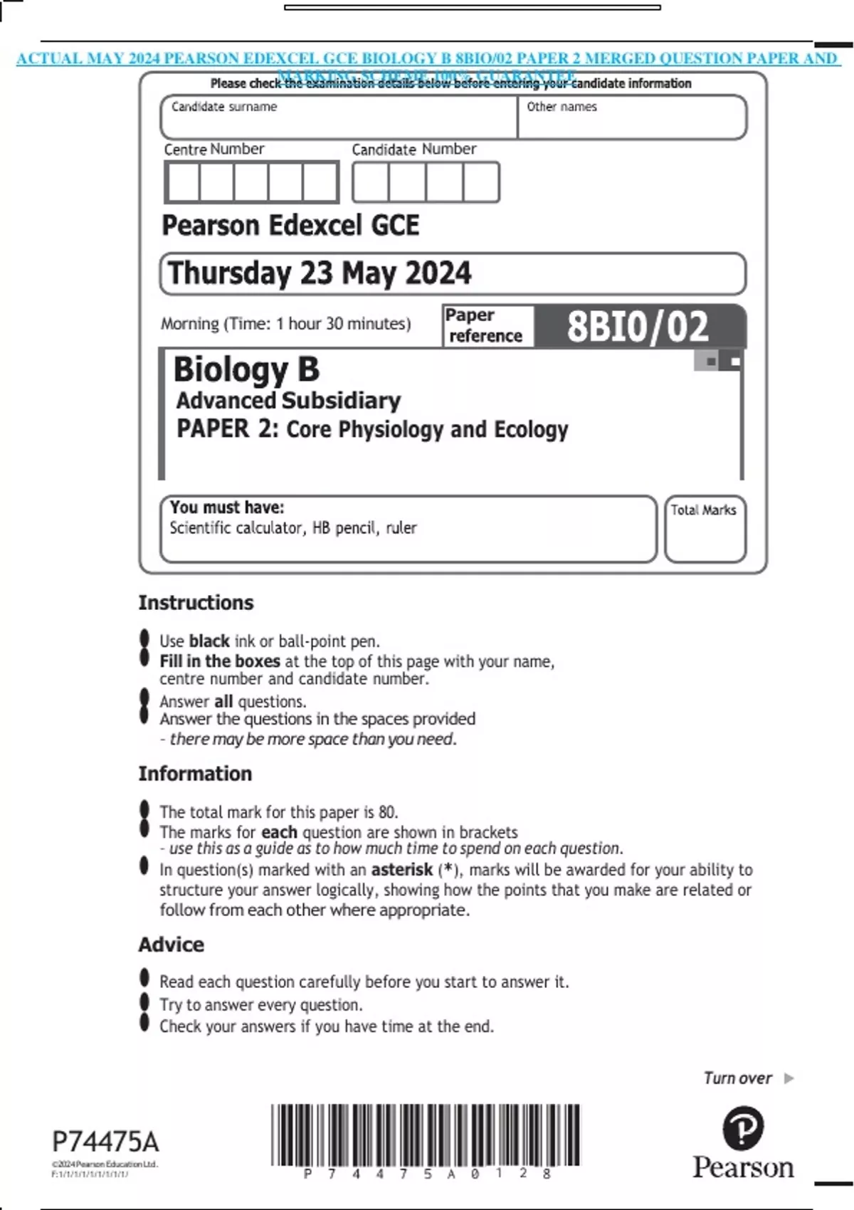 ACTUAL MAY 2024 PEARSON EDEXCEL GCE BIOLOGY B 8BIO/02 PAPER 2 MERGED QUESTION PAPER AND MARKING SCHEME 100% GUARANTEE