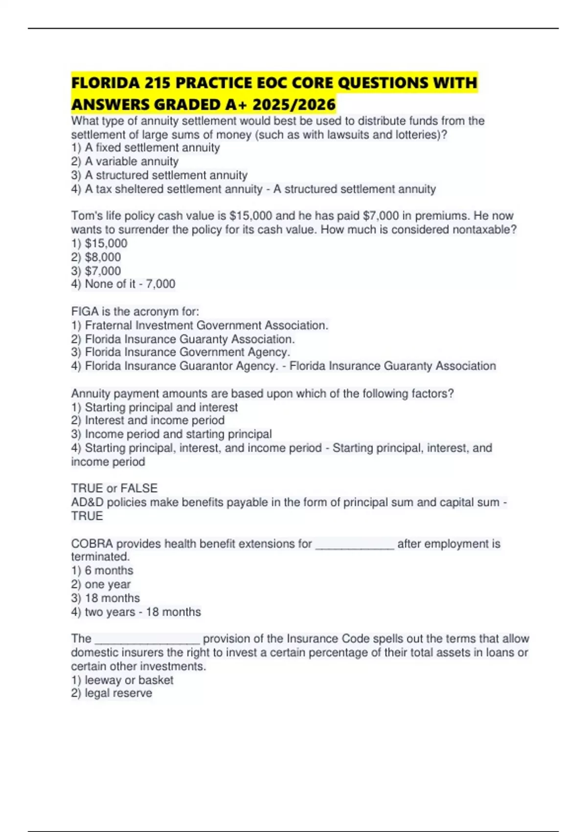 What type of annuity settlement would best be used to distribute funds from the settlement of large sums of money (such as with lawsuits and lotteries)? 1) A fixed settlement annuity 2) A variable annuity 3) A structured settlement annuity 4) A tax sheltered settlement annuity - A structured settlement annuity Tom's life policy cash value is $15,000 and he has paid $7,000 in premiums. He now wants to surrender the policy for its cash value. How much is considered nontaxable? 1) $15,000 2) $8,000 3) $7,000 4) None of it - 7,000 FIGA is the acronym for: 1) Fraternal Investment Government Association. 2) Florida Insurance Guaranty Association. 3) Florida Insurance Government Agency. 4) Florida Insurance Guarantor Agency. - Florida Insurance Guaranty Association Annuity payment amounts are based upon which of the following factors? 1) Starting principal and interest 2) Interest and income period 3) Income period and starting principal