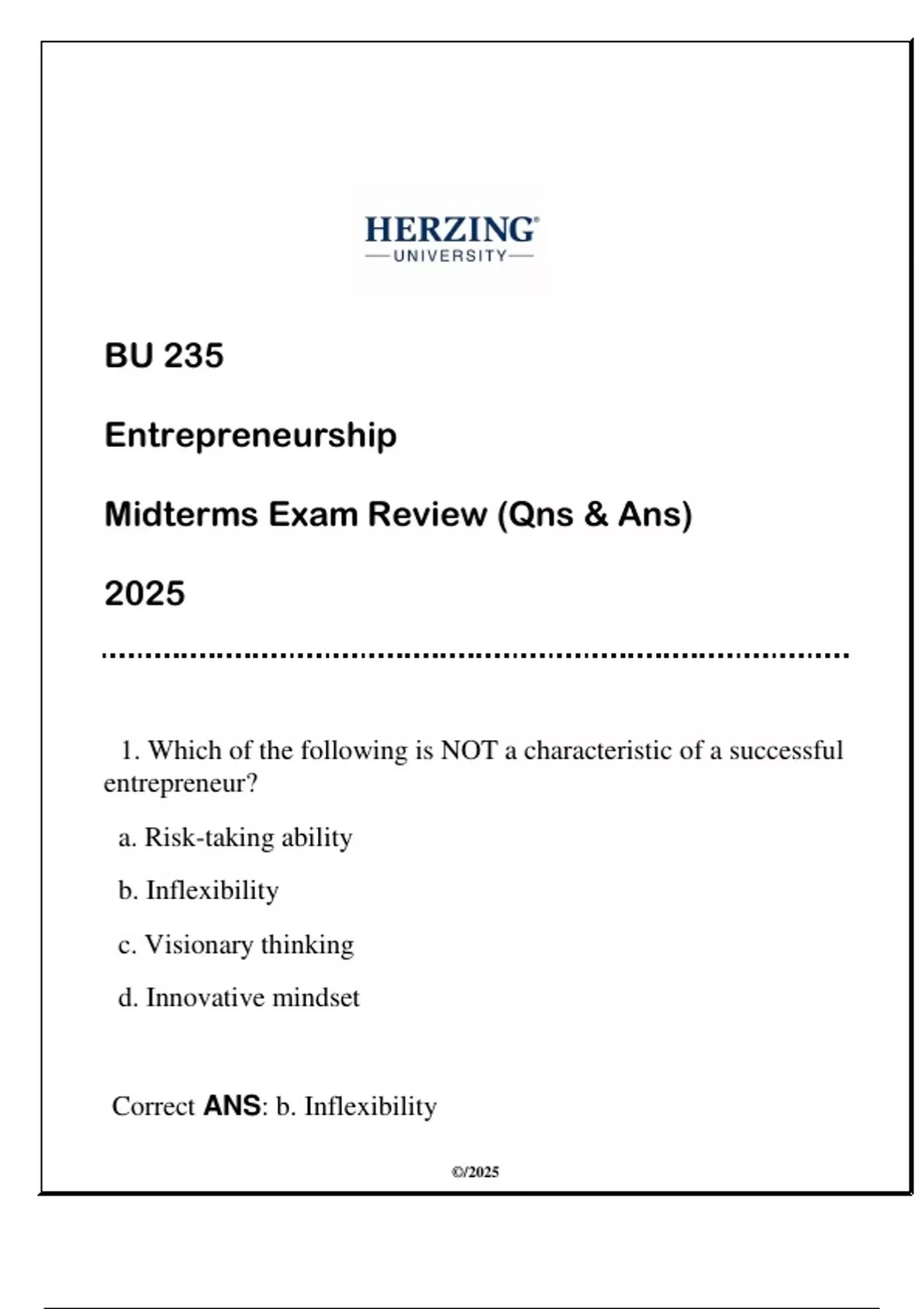 BU 235 Entrepreneurship (HU) Midterms Qns & Ans 2025