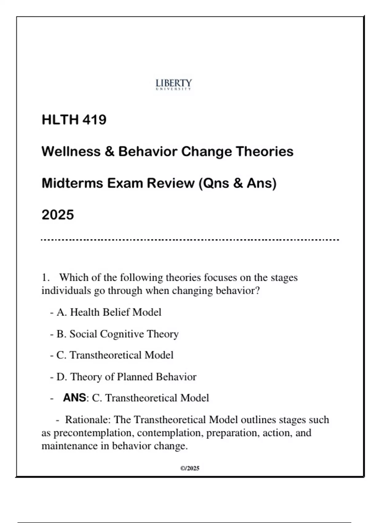 HLTH 419 Wellness & Behavior Change Theories (LU) Midterms Qns & Ans 2025.HLTH 419 Wellness & Behavior Change Theories (LU) Midterms Qns & Ans 2025.HLTH 419 Wellness & Behavior Change Theories (LU) Midterms Qns & Ans 2025.