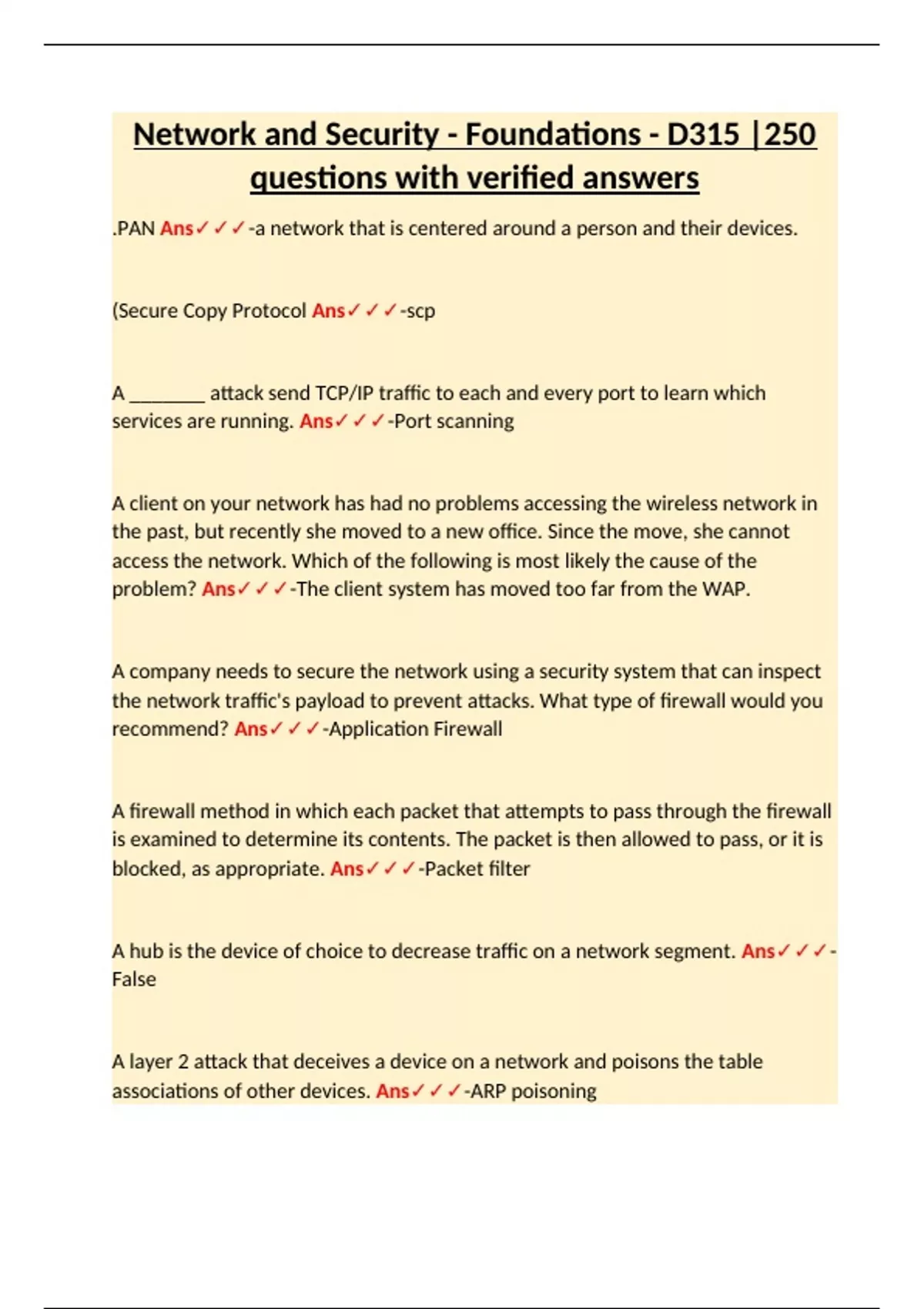 .PAN Ans-a network that is centered around a person and their devices. (Secure Copy Protocol Ans-scp A _______ attack send TCP/IP traffic to each and every port to learn which services are running. Ans-Port scanning A client on your network has had no problems accessing the wireless network in the past, but recently she moved to a new office. Since the move, she cannot access the network. Which of the following is most likely the cause of the problem? Ans-The client system has moved too far from the WAP. A company needs to secure the network using a security system that can inspect the network traffic's payload to prevent attacks. What type of firewall would you recommend? Ans-Application Firewall A firewall method in which each packet that attempts to pass through the firewall is examined to determine its contents. The packet is then allowed to pass, or it is blocked, as appropriate. Ans-Packet filter A hub is the device of choice to decrease traffic on a network segment. Ans-False