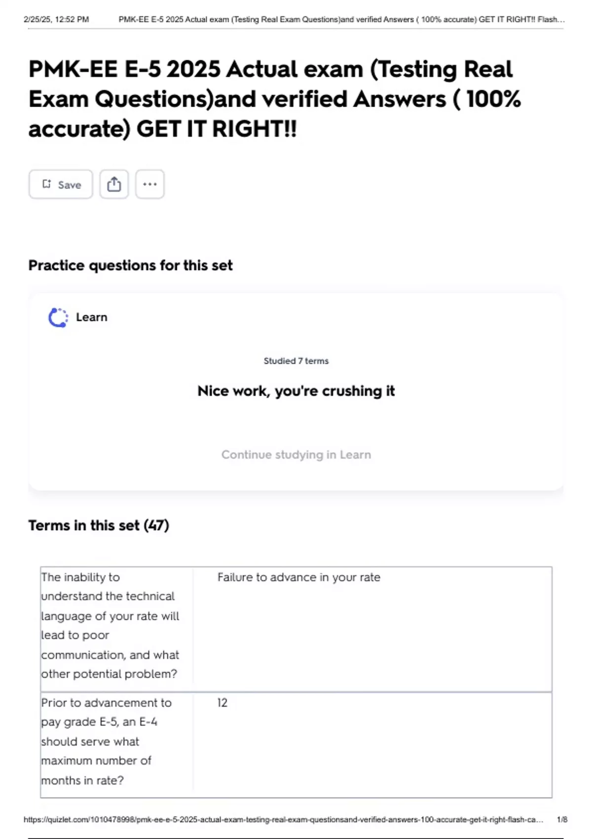 , 2/25/25, 12:52 PM PMK-EE E-5 2025 Actual exam (Testing Real Exam Questions)and verified Answers ( 100% accurate) GET IT RIGHT!! Flash…