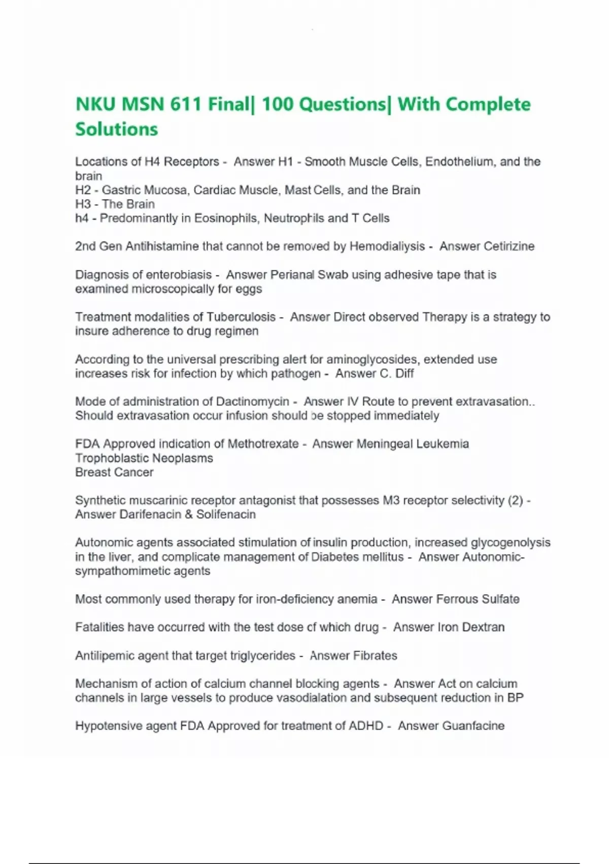 NKU MSN 611 Final| 100 Questions| With Complete Solutions Locations of H4 Receptors - Answer H1 - Smooth Muscle Cells, Endothelium, and the brain H2 - Gastric Mucosa, Cardiac Muscle, Mast Cells, and the Brain H3 - The Brain h4 - Predominantly in Eosinophils, Neutrophils and T Cells 2nd Gen Antihistamine that cannot be removed by Hemodialiysis - Answer Cetirizine Diagnosis of enterobiasis - Answer Perianal Swab using adhesive tape that is examined microscopically for eggs Treatment modalities of Tuberculosis - Answer Direct observed Therapy is a strategy to insure adherence to drug regimen According to the universal prescribing alert for aminoglycosides, extended use increases risk for infection by which pathogen - Answer C. Diff Mode of administration of Dactinomycin - Answer IV Route to prevent extravasation.. Should extravasation occur infusion should be stopped immediately FDA Approved indication of Methotrexate - Answer Meningeal Leukemia Trophoblastic Neoplasms Breast Cancer Synthetic muscarinic receptor antagonist that possesses M3 receptor selectivity (2) - Answer Darifenacin & Solifenacin Autonomic agents associated stimulation of insulin production, increased glycogenolysis in the liver, and complicate management of Diabetes mellitus - Answer Autonomic-sympathomimetic agents Most commonly used therapy for iron-deficiency anemia - Answer Ferrous Sulfate Fatalities have occurred with the test dose of which drug - Answer Iron Dextran Antilipemic agent that target triglycerides - Answer Fibrates Mechanism of action of calcium channel blocking agents - Answer Act on calcium channels in large vessels to produce vasodialation and subsequent reduction in BP Hypotensive agent FDA Approved for treatment of ADHD - Answer Guanfacine