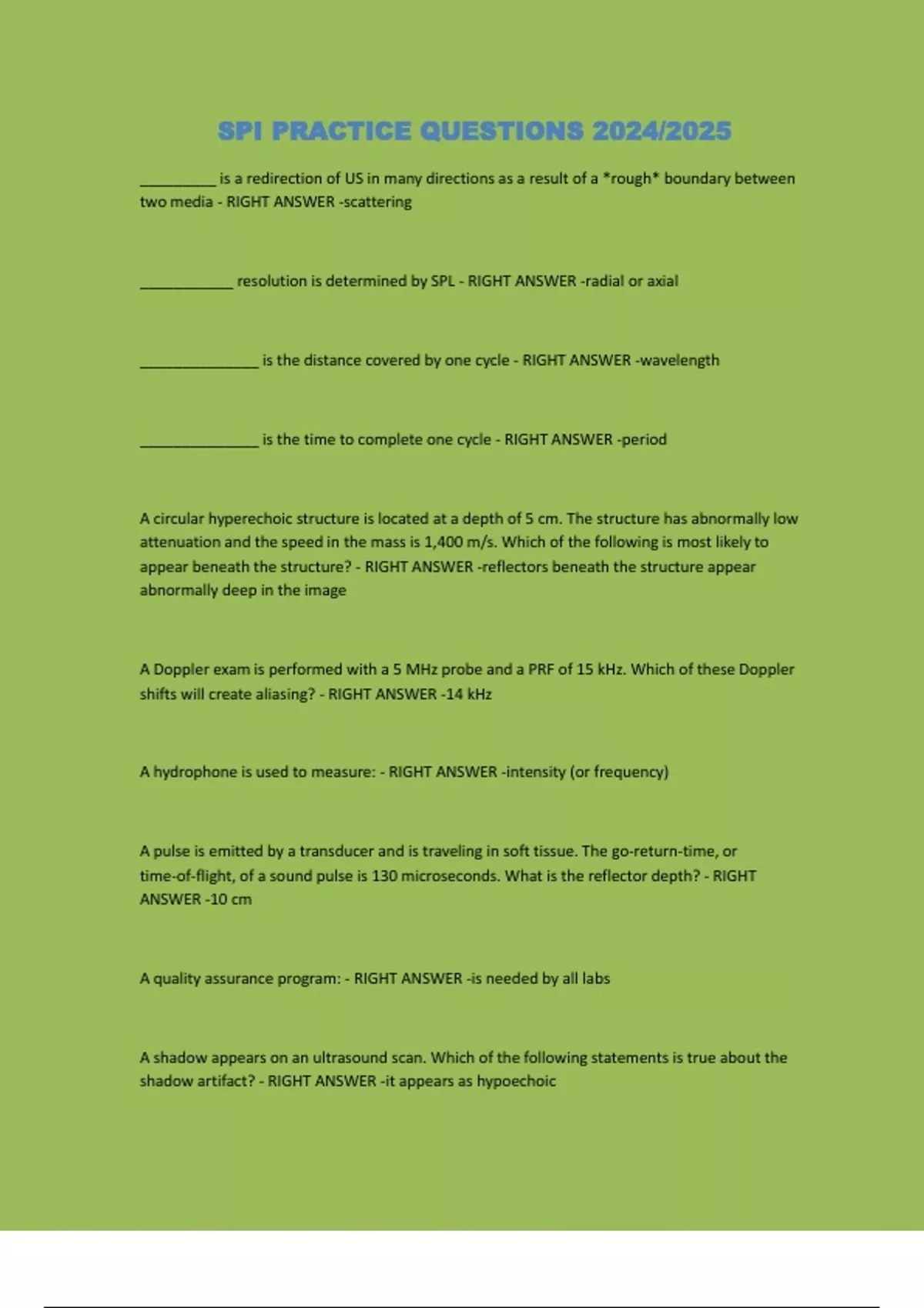 SPI PRACTICE QUESTIONS 2024/2025 _________ is a redirection of US in many directions as a result of a *rough* boundary between two media - RIGHT ANSWER -scattering ___________ resolution is determined by SPL - RIGHT ANSWER -radial or axial ______________ is the distance covered by one cycle - RIGHT ANSWER -wavelength ______________ is the time to complete one cycle - RIGHT ANSWER -period A circular hyperechoic structure is located at a depth of 5 cm. The structure has abnormally low attenuation and the speed in the mass is 1,400 m/s. Which of the following is most likely to appear beneath the structure? - RIGHT ANSWER -reflectors beneath the structure appear abnormally deep in the image A Doppler exam is performed with a 5 MHz probe and a PRF of 15 kHz. Which of these Doppler shifts will create aliasing? - RIGHT ANSWER -14 kHz A hydrophone is used to measure: - RIGHT ANSWER -intensity (or frequency) A pulse is emitted by a transducer and is traveling in soft tissue. The go-return-time, or time-of-flight, of a sound pulse is 130 microseconds. What is the reflector depth? - RIGHT ANSWER -10 cm A quality assurance program: - RIGHT ANSWER -is needed by all labs A shadow appears on an ultrasound scan. Which of the following statements is true about the shadow artifact? - RIGHT ANSWER -it appears as hypoechoic A shadow appears on an ultrasound scan. Which of the following statements is true about the structure immediately above the shadowing artifact? - RIGHT ANSWER -attenuation properties are too high A single element transducer is focused: - RIGHT ANSWER -by the manufacturer A sound beam is created by a single, disc-shaped crystal. Which of these beams has the shallowest focus? - RIGHT ANSWER -2 MHz, 9 mm diameter A sound wave is traveling in the body and propagating from one form of soft tissue to another. For example, sound is moving from muscle to blood. What percentage of the sound wave is most likely to be reflected at the muscle-blood boundary? - RIGHT ANSWER -.5% A sound wave with a frequency of 5 MHz is travelling in soft tissue. What is the wavelength? - RIGHT ANSWER -.3 mm A sound wave's frequency is 10 MHz. The wave is traveling in soft tissue. What is its wavelength? - RIGHT ANSWER -.15 mm A system which is not working well now does not display clear images in the far field. This may be a problem with: - RIGHT ANSWER -transducer, receiver, monitor, or scan converter A transducer converts __________ from one form to another - RIGHT ANSWER -energy A transducer with more than one active element is called: - RIGHT ANSWER -array According to AIUM, there have been no confirmed bioeffects below intensities of ______ watts per square centimeter SPTA - RIGHT ANSWER -.01 Aliasing is an artifact observed when performing Doppler ultrasonography. Which of the following signals is most likely to alias? - RIGHT ANSWER -7 MHz with a PRF of 3 kHz All of the following are limitations of analog scan converts EXCEPT: - RIGHT ANSWER -low spatial resolution All of the following are primarily used to change the overall brightness of an entire image EXCEPT: - RIGHT ANSWER -compensation All of the following are true EXCEPT: - RIGHT ANSWER -two waves with identical frequencies must interfere constructively All of the following are true EXCEPT: - RIGHT ANSWER -two waves with identical frequencies must interfere constructively All of the following are true of normal cavitation EXCEPT: - RIGHT ANSWER -harmful bioeffects are commonly observed All of the following are true regarding temporal resolution EXCEPT: - RIGHT ANSWER -decreased temporal resolution is associated with shorter pulse duration All of the following artifacts place the erroneous reflection below the true reflector EXCEPT: - RIGHT ANSWER -side lobe All of the following describe dynamic range EXCEPT: logarithmic, comparison, relative, absolute, ratio - RIGHT ANSWER -absolute All of the following regarding the hemodynamics of a stenosis are true EXCEPT: - RIGHT ANSWER -pressure is lowest downstream All of the following result from the use of backing material in a transducer EXCEPT: - RIGHT ANSWER -high sensitivity All of the following statements regarding in-vitro bioeffects are true EXCEPT: - RIGHT ANSWER -in-vitro bioeffects conclusions are clinically relevant All of the following will improve temporal resolution EXCEPT: - RIGHT ANSWER -increased line density An image is too dark. Which technique is best to correct this problem? - RIGHT ANSWER -increase receiver gain An individual is standing. The blood pressure generated by the heart is 120 mmHg. What is the hydrostatic pressure at the ankle? - RIGHT ANSWER -100 mmHg An ultrasound system is imaging to a depth of 10 cm. Which of the following will be different on a single image at depths of 2 cm, 5 cm, and 10 cm? - RIGHT ANSWER -lateral resolution An ultrasound system is operating in the harmonic mode. The image on the display of the ultrasound system was created using sound reflections with a frequency of 6 MHz. What is the frequency of sound emitted by the system's transducer? - RIGHT ANSWER -3 MHz An ultrasound system is set at 0 dB and is transmitting at full intensity. What is the output power when the system is transmitting at 10% of full intensity? - RIGHT ANSWER --10 dB An ultrasound system is set at 0 dB and is transmitting at full intensity. What is the output power when the system is transmitting at 50% of full intensity? - RIGHT ANSWER --3 dB An ultrasound system's display is too bright. Which of the following techniques is best to correct this problem? - RIGHT ANSWER -decrease output power An US machine has a digital scan converter, but has an analog input signal. The machine needs to have a: - RIGHT ANSWER -analog to digital converter An US wave travels through two media and has attenuation of 3 dB in the first and 5 dB in the second. What is the total attenuation? - RIGHT ANSWER -8 dB As a result of ______________, the propagation speed increases - RIGHT ANSWER -decreasing compr