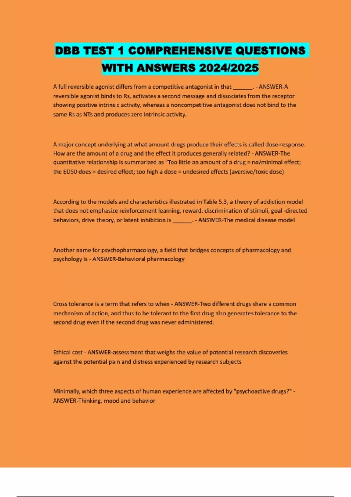 DBB TEST 1 COMPREHENSIVE QUESTIONS WITH ANSWERS 2024/2025 A full reversible agonist differs from a competitive antagonist in that ______. - ANSWER-A reversible agonist binds to Rs, activates a second message and dissociates from the receptor showing positive intrinsic activity, whereas a noncompetitive antagonist does not bind to the same Rs as NTs and produces zero intrinsic activity. A major concept underlying at what amount drugs produce their effects is called dose-response. How are the amount of a drug and the effect it produces generally related? - ANSWER-The quantitative relationship is summarized as "Too little an amount of a drug = no/minimal effect; the ED50 does = desired effect; too high a dose = undesired effects (aversive/toxic dose) According to the models and characteristics illustrated in Table 5.3, a theory of addiction model that does not emphasize reinforcement learning, reward, discrimination of stimuli, goal -directed behaviors, drive theory, or latent inhibition is ______. - ANSWER-The medical disease model Another name for psychopharmacology, a field that bridges concepts of pharmacology and psychology is - ANSWER-Behavioral pharmacology Cross tolerance is a term that refers to when - ANSWER-Two different drugs share a common mechanism of action, and thus to be tolerant to the first drug also generates tolerance to the second drug even if the second drug was never administered. Ethical cost - ANSWER-assessment that weighs the value of potential research discoveries against the potential pain and distress experienced by research subjects Minimally, which three aspects of human experience are affected by "psychoactive drugs?" - ANSWER-Thinking, mood and behavior objective effects - ANSWER- Once a person is addicted to a substance, and they go abstinent, they remain predisposed (mentally and physiologically/genetically) to drug use rather than returning to a point of cure that precludes relapsing. Why? - ANSWER-Treatments have yet to be developed that reverse the lasting effects of drug addiction, and whereas a person can be in remission, relapse always remains a possibility. open-label studies - ANSWER-assignment of study treatments without using blinded procedures Other than functioning as an agonist to mimic NT effects at Rs other drugs can act to enhance NT activity (such as entacapone) by... - ANSWER-Binding to and inhibitng the enzyme that breaks down the NT dopamine. pharmacodynamics - ANSWER- pharmacogenetics - ANSWER- pharmacokinetics - ANSWER- Pharmocotherapeutics - ANSWER- Potency - ANSWER- psychoactive drugs - ANSWER- psychopharmacology - ANSWER- recreational drug - ANSWER- recreational drug use - ANSWER- Regarding factors influencing heroin tolerance and overdose, what are the conclusions reached following experiments conducted by Siegel and colleagues that may explain why some experienced heroin users overdose? - ANSWER-Some protection from overdose due to developing tolerance is environmental conditioned and can be reversed by drug use in different environmental conditioned, and can be reversed by drug use in different environmental cues and can lead to death by overdose. Relapse is part of the third stage of addiction, and this also involves changes in learning. But now instead of the NT _____, the NT ______ has been shown to elicit drug seeking and trigger incentive value (wanting) in the presence of stimuli associated with drug use to promote relapse. - ANSWER-dopamine/glutamate Safety Pharmacology - ANSWER- street name - ANSWER- subjective effects - ANSWER- Table 5.2 depicts the harm ratings of selected drugs. Which single drug has a lower addiction rating than a physical harm rating? - ANSWER-Inhaled solvents. Teratogen - ANSWER-any factor that can cause a birth defect The modern behavioral task, introduced by Dr. Larry D. Reid, named ______ is used to measure the rewarding aspects of drugs. The brain structures underlying the rewarding properties of drugs of abuse include the cortical-amygdala and orbital frontal cortical pathways and can be reliably demonstrated when animals are tested drug free using a combination of operant and classical conditioning learning tasks. - ANSWER-Conditioned place preferance The process of metabolism, distribution, elimination and absorption refer to - ANSWER-The exact order of how drugs pass through the body respectively. The stunning impact of Old's and Milner's 1954 discovery was that our brains have hard-wired compulsive and aversion reinforcement pathways that can be activated and regulated externally using electrical brain stimulation as is illustrated in Figure 5.3. Soon evidence was collected to support the finding that elevation of ______ in the _____ underlie intracranial self-stimulation. Similar rewards stimuli are generated by many drugs of abuse and natural stimuli (generated by food, sex, and social situations). - ANSWER-dopamine levels/nucleus accumbens The terms ligand and binding affinity respectively refer to ______ and ______. - ANSWER-that which binds (attaches) to Rs and the degree of stickiness (strength) of the attachment at Rs Therapeutic drug - ANSWER- therapeutic index - ANSWER- There are four types of tolerance. Correctly identify just 4 types of tolerance below - ANSWER-Behavioral, pharmokinetics, cross and pharmacodynamic There are several treatments in use for drug addicted individuals including drug replacement therapy, behavioral therapy, and cognitive-behavioral therapy (e.g., the 12-step programs of AA and NA). What is the required first step of each of these recovery programs? - ANSWER-detoxification There are six major stages of therapeutic drug development. How does stage 3 differ from stage 5? - ANSWER-Stage 3 is concerned with drug synthesis and identification whereas Stage 5 uses slower screening with animal testing for product validity. trade name - ANSWER- treatment arms - ANSWER- What are four goals of clinical trials that need to be met in order for the FDA to grant appr