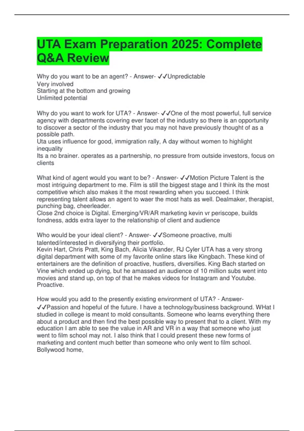 UTA Exam Preparation 2025: Complete Q&A Review Why do you want to be an agent? - Answer- Unpredictable Very involved Starting at the bottom and growing Unlimited potential Why do you want to work for UTA? - Answer- One of the most powerful, full service agency with departments covering ever facet of the industry so there is an opportunity to discover a sector of the industry that you may not have previously thought of as a possible path. Uta uses influence for good, immigration rally, A day without women to highlight inequality Its a no brainer. operates as a partnership, no pressure from outside investors, focus on clients What kind of agent would you want to be? - Answer- Motion Picture Talent is the most intriguing department to me. Film is still the biggest stage and I think its the most competitive which also makes it the most rewarding when you succeed. I think representing talent allows an agent to waer the most hats as well. Dealmaker, therapist, punching bag, cheerleader. Close 2nd choice is Digital. Emerging/VR/AR marketing kevin vr periscope, builds fondness, adds extra layer to the relationship of client and audience Who would be your ideal client? - Answer- Someone proactive, multi talented/interested in diversifying their portfolio. Kevin Hart, Chris Pratt, King Bach, Alicia Vikander, RJ Cyler UTA has a very strong digital department with some of my favorite online stars like Kingbach. These kind of entertainers are the definition of proactive, hustlers, diversifies. King Bach started on Vine which ended up dying, but he amassed an audience of 10 million subs went into movies and stand up, on top of that he makes videos for Instagram and Youtube. Proactive. How would you add to the presently existing environment of UTA? - Answer- Passion and hopeful of the future. I have a technology/business background. WHat I studied in college is meant to mold consultants. Someone who learns everything there about a product and then find the best possible way to present that to a client. With my education I am able to see the value in AR and VR in a way that someone who just went to film school may not. I also think that I could present these new forms of marketing and content much better than someone who only went to film school. Bollywood home, Are you aware that this is hard work, long hours, low pay, and a 3 year commitment? - Answer- Yes. I wont learn anything without hard work and long hours. This is what I want to do with my life so the commitment is already given. I survived 2 years in New York living paycheck to check. What are your favorite area of entertainment? - Answer- Youtube, Opening night Movies. Emerging VR