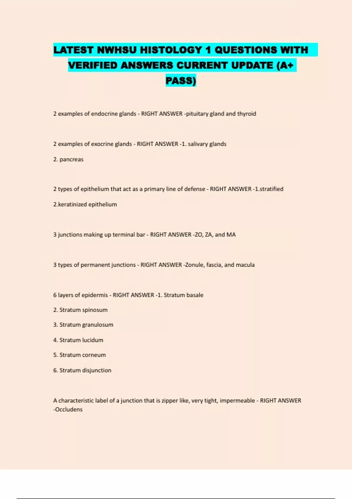 LATEST NWHSU HISTOLOGY 1 QUESTIONS WITH VERIFIED ANSWERS CURRENT UPDATE (A+ PASS) 2 examples of endocrine glands - RIGHT ANSWER -pituitary gland and thyroid 2 examples of exocrine glands - RIGHT ANSWER -1. salivary glands 2. pancreas 2 types of epithelium that act as a primary line of defense - RIGHT ANSWER -ified inized epithelium 3 junctions making up terminal bar - RIGHT ANSWER -ZO, ZA, and MA 3 types of permanent junctions - RIGHT ANSWER -Zonule, fascia, and macula 6 layers of epidermis - RIGHT ANSWER -1. Stratum basale 2. Stratum spinosum 3. Stratum granulosum 4. Stratum lucidum 5. Stratum corneum 6. Stratum disjunction A characteristic label of a junction that is zipper like, very tight, impermeable - RIGHT ANSWER -Occludens A characteristic label of a junction that tightens as it is pulled apart - RIGHT ANSWER -Adherens A junction that is "strip" like - RIGHT ANSWER -Fascia a protein that is entirely through the membrane - RIGHT ANSWER -integral a protein that is partially through the membrame - RIGHT ANSWER -Associated ability to change cellular shape - RIGHT ANSWER -contractility ability to modify the resting membrane potential - RIGHT ANSWER -conductivity ability to use raw materials to make energy - RIGHT ANSWER -Respiration all cells must do what 2 funtions - RIGHT ANSWER -growth and respiration bits of rRNA come together to make what enzyme system - RIGHT ANSWER -ribosome Branched exocrine gland - RIGHT ANSWER -Compound Cells of the stratum basale that are sensory receptors - RIGHT ANSWER -Merkel disc Cells of the stratum spinosum, react to environmental irritation - RIGHT ANSWER -Langerhons cells cellular absorption - RIGHT ANSWER -endocytosis cellular absorption of particulates - RIGHT ANSWER -phagocytosis cellular absorption of soluble ions w/h20 - RIGHT ANSWER -pinocytosis cellular excretion/secretion - RIGHT ANSWER -exocytosis cellular growth increasing in number - RIGHT ANSWER -hyperplasia cellular growth increasing in size - RIGHT ANSWER -hypertrophy compare and contrast : microvilli vs cilia - RIGHT ANSWER -1. both are extensions of the membrane are long and microvilli are short are movement, microvilli are absorption 4. cilia have 9 doublets and 2 singlets compare and contrast : terminal Bar vs Terminal Web - RIGHT ANSWER -1. tb is part of membrane, tw is part of cytoplasm anchors filaments that affect mifrovilli (actin and myosin) tb is a junction between adjacent absorptive cells cant have tw, ciliated cells can have TB 4.Both involve secretion and absorpt compare and contrast centrioles vs cilia - RIGHT ANSWER -ioles are organelles, cilia are not 2. centrioles have 9 triplets, cilia have 9 doublets plus 2 3. both have microtubules 4. cilia=movement. centrioles= organize cell division compare and contrast: centrioles vs. microtubules - RIGHT ANSWER -ioles are organelles and microtubules are modification of the membrane 2. both are involved in forming mitotic spindles are non-membrane bound 4. centrioles -> basal bodies to anchor microtubules compare and contrast: golgi vs. rER - RIGHT ANSWER -1. golgi has double membrane, rER has a single is responsible for packaging and sorting (glycosylation), rER transports protein components to golgi. 3.rER is a site of translation compare and contrast: microtubules vs microfilaments - RIGHT ANSWER - are non-membrane bound tubules are hollow, microfilaments are solid tubules are the core of cilia, microfilaments are core of microvilli tubules are bigger than microfilaments Compare and contrast: Mitochondrion vs. nucleus - RIGHT ANSWER -1. both have double unit membrane 2.Mitochondria makes ATP, Nucleus is the control center of the cell compare and contrast: ribosomes vs. nucleolus - RIGHT ANSWER -ribosomes (rER) translate proteins for export, nucleolus synthesizes ribosomes are non-membrane bound omes come from nucleolus electrical difference between the inside and outside of the membrane - RIGHT ANSWER -Resting potential electron transport chain occurs in the ______ - RIGHT ANSWER -cristae entire cells are secreted - RIGHT ANSWER -Holocrine glands epithelium associated with absorption - RIGHT ANSWER -1. simple epithelia 2. microvilli epithelium associated with diffusion of gases - RIGHT ANSWER -simple squamous epithelium epithelium associated with respiratory tissue - RIGHT ANSWER -pseudostratified columnar with cilia and goblet cells epithelium associated with secretion - RIGHT ANSWER -glandular epithelium Epithelium is named by what - RIGHT ANSWER -Outer most layer of cells epithelium lining A/V and capillaries, as well as sweat glands - RIGHT ANSWER -stratified cuboidal epithelium epithelium lining small intestine - RIGHT ANSWER -simple columnar with microvilli and goblet cells epithelium making up the epidermis - RIGHT ANSWER -stratified squamous keratinizing epithelium epithelium of the esophagus - RIGHT ANSWER -stratified squamous non-keratinizing epithelium features of an exocrine gland - RIGHT ANSWER -1. directly connected to apical part of epithelium 2. can be branched/nonbranched features of Pseudostratified epithelia - RIGHT ANSWER -1.NO TW 2.Basal bodies anchor cilia ocytes present (respiratory tract) and goblet cell cells contact BM, not all contact free surface Function of umbrella cells - RIGHT ANSWER -Change shape with pressure functions involving the cell membrane - RIGHT ANSWER -absorption, secretion, excretion gap junctions vs. tight junctions - RIGHT ANSWER -1. tight junctions seal adjacent epithelial cells. 2. gap junction are intercellular channels, permit free passage between the cells give 2 examples of organelles with double unit membranes - RIGHT ANSWER -nucleus, mitochondria give 3 examples of organelles with a single unit membrane - RIGHT ANSWER -rER, sER, and lysosomes glands of "internal secretion" that secrete directly to the bloodx - RIGHT ANSWER -Endocrine glands that have ducts to carry secretions to specific locations - RIGHT ANSWER -exocrine glycolysis occurs in the _______ - RIGHT ANSWER -