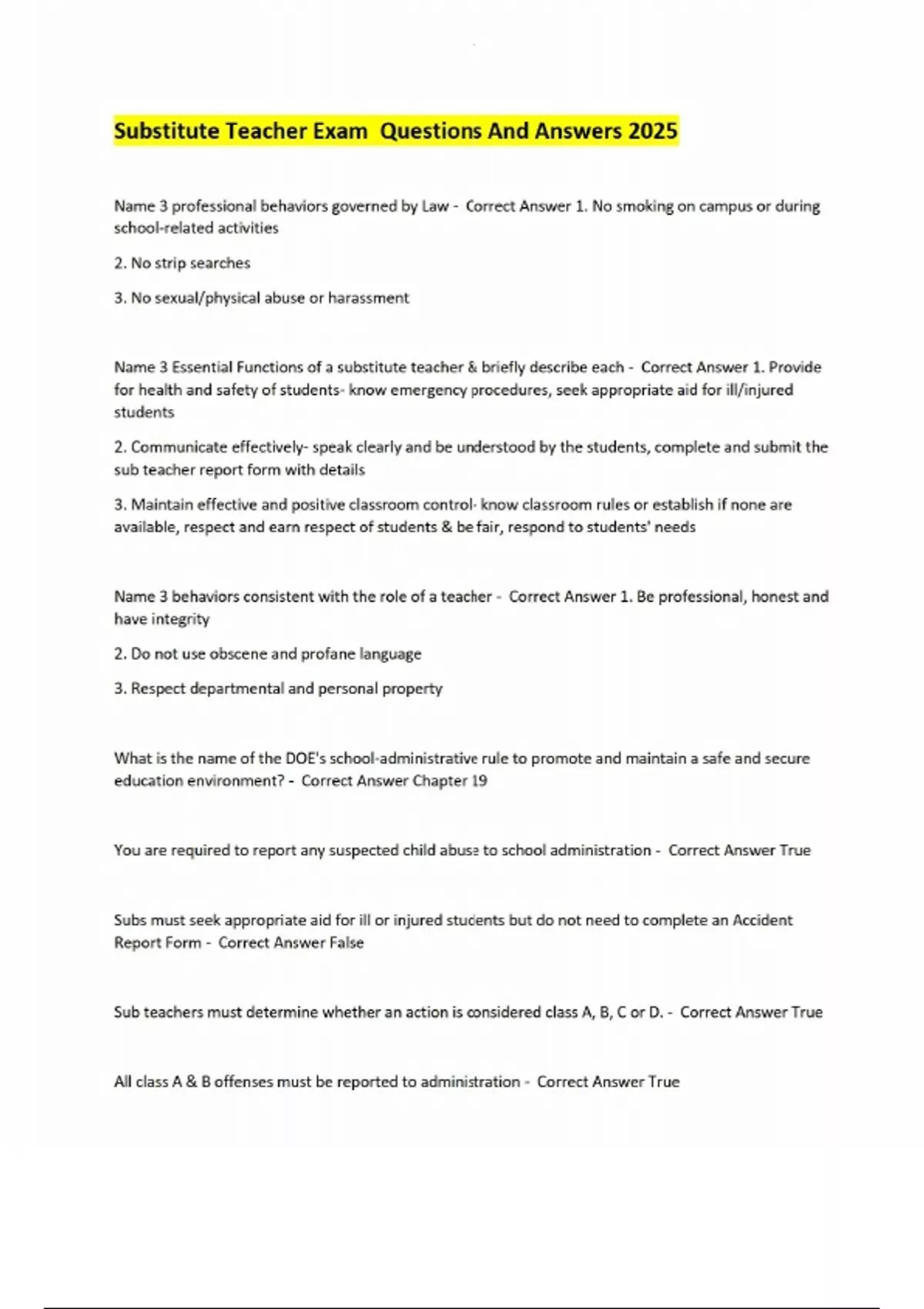 Substitute Teacher Exam Questions And Answers 2025 Name 3 professional behaviors governed by Law - Correct Answer 1. No smoking on campus or during school-related activities 2. No strip searches 3. No sexual/physical abuse or harassment Name 3 Essential Functions of a substitute teacher & briefly describe each - Correct Answer 1. Provide for health and safety of students- know emergency procedures, seek appropriate aid for ill/injured students 2. Communicate effectively- speak clearly and be understood by the students, complete and submit the sub teacher report form with details 3. Maintain effective and positive classroom control- know classroom rules or establish if none are available, respect and earn respect of students & be fair, respond to students' needs Name 3 behaviors consistent with the role of a teacher - Correct Answer 1. Be professional, honest and have integrity 2. Do not use obscene and profane language 3. Respect departmental and personal property What is the name of the DOE's school-administrative rule to promote and maintain a safe and secure education environment? - Correct Answer Chapter 19 You are required to report any suspected child abuse to school administration - Correct Answer True Subs must seek appropriate aid for ill or injured students but do not need to complete an Accident Report Form - Correct Answer False