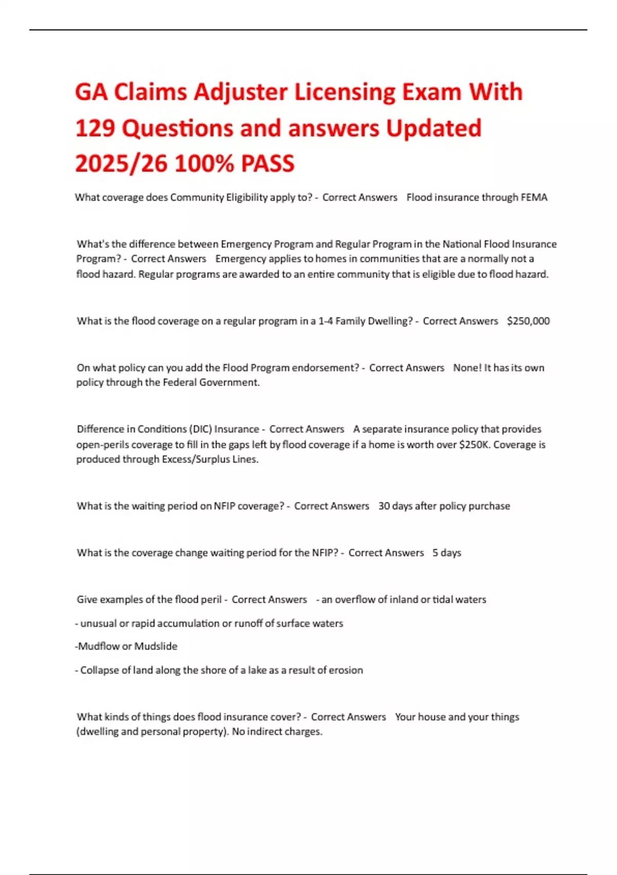 GA Claims Adjuster Licensing Exam With 129 Questions and answers Updated 2025/26 100% PASS