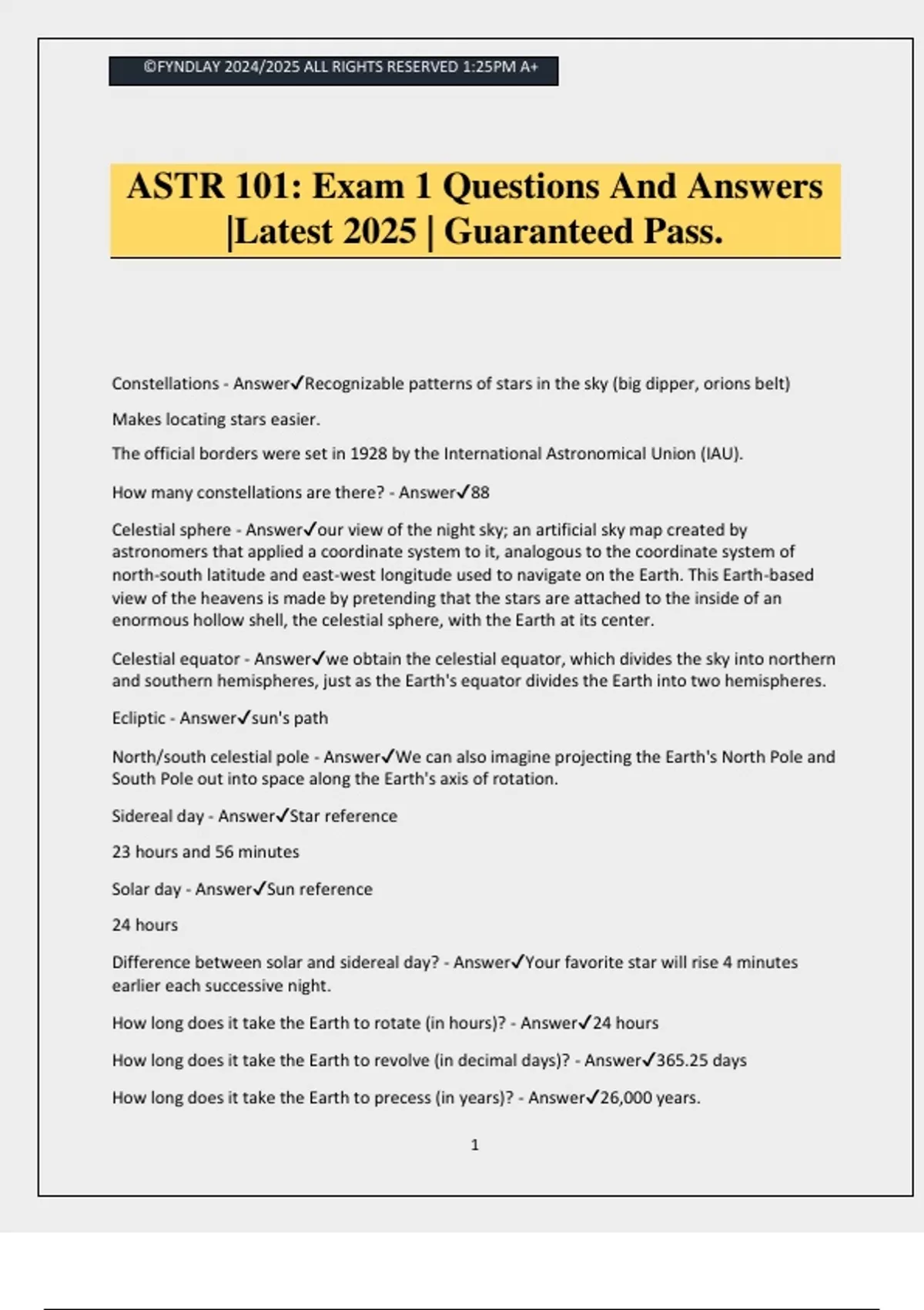 ©FYNDLAY 2024/2025 ALL RIGHTS RESERVED 1:25PM A+ 1 ASTR 101: Exam 1 Questions And Answers |Latest 2025 | Guaranteed Pass. Constellations - AnswerRecognizable patterns of stars in the sky (big dipper, orions belt) Makes locating stars easier. The official borders were set in 1928 by the International Astronomical Union (IAU). How many constellations are there? - Answer88 Celestial sphere - Answerour view of the night sky; an artificial sky map created by astronomers that applied a coordinate system to it, analogous to the coordinate system of north-south latitude and east-west longitude used to navigate on the Earth. This Earth-based view of the heavens is made by pretending that the stars are attached to the inside of an enormous hollow shell, the celestial sphere, with the Earth at its center. Celestial equator - Answerwe obtain the celestial equator, which divides the sky into northern and southern hemispheres, just as the Earth's equator divides the Earth into two hemispheres. Ecliptic - Answersun's path North/south celestial pole - AnswerWe can also imagine projecting the Earth's North Pole and South Pole out into space along the Earth's axis of rotation. Sidereal day - AnswerStar reference 23 hours and 56 minutes Solar day - AnswerSun reference 24 hours Difference between solar and sidereal day? - AnswerYour favorite star will rise 4 minutes earlier each successive night. How long does it take the Earth to rotate (in hours)? - Answer24 hours How long does it take the Earth to revolve (in decimal days)? - Answer365.25 days How long does it take the Earth to precess (in years)? - Answer26,000 years. ©FYNDLAY 2024/2025 ALL RIGHTS RESERVED 1:25PM A+ 2 What causes seasons? - AnswerEarths rotation on its axis which is 23.5 degrees Equinox - Answerwhere the ecliptic intersects the celestial equator Solsitice - Answerwhere the ecliptic is farthest from the celestial equator Summer Solstice - AnswerJune 21st Winter Solstice - AnswerDecember 21st Fall Equinox - AnswerSeptember 21st Spring Equinox - AnswerMarch 21st Longest day of the year - AnswerJune 21st (beginning of summer) Shortest day of the year - AnswerDecember 21st (beginning of winter) Lunar phases - AnswerNew moon: 0% visible Waxing crescent: 1-49% visible First quarter: 50% Waxing gibbous: 51-99% visible Full moon:100% visible Waning gibbous: 99-51% visible Third (last) quarter: 50% visible Waning crescent: 49-1% visible Length of a lunar month - Answer29.5 day cycle Length of the Moon's orbit around the Earth - Answer27.3 days Length of the Moon's rotation on its axis - Answer27.3 days Why do we see phases of the Moon? - Answerthe revolution of the moon around the Earth allows us to see different amounts of the moon being illuminated Why do we see the same face of the Moon from Earth? - Answerthe moons rotation period=moons orbital period. The moon has a heavy metal side Three types of solar eclipses - Answer1)total 2)partial 3)annular (moon is closer to the sun, get a ring) Three types of lunar eclipses
