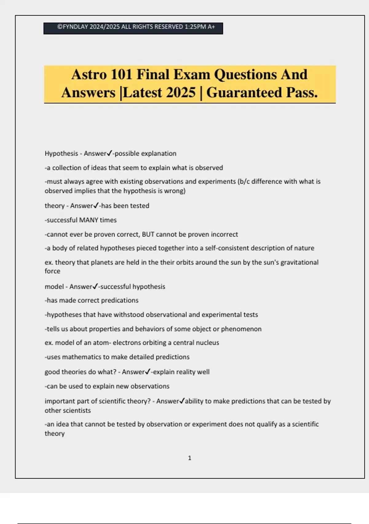©FYNDLAY 2024/2025 ALL RIGHTS RESERVED 1:25PM A+ 1 Astro 101 Final Exam Questions And Answers |Latest 2025 | Guaranteed Pass. Hypothesis - Answer-possible explanation -a collection of ideas that seem to explain what is observed -must always agree with existing observations and experiments (b/c difference with what is observed implies that the hypothesis is wrong) theory - Answer-has been tested -successful MANY times -cannot ever be proven correct, BUT cannot be proven incorrect -a body of related hypotheses pieced together into a self-consistent description of nature ex. theory that planets are held in the their orbits around the sun by the sun's gravitational force model - Answer-successful hypothesis -has made correct predications -hypotheses that have withstood observational and experimental tests -tells us about properties and behaviors of some object or phenomenon ex. model of an atom- electrons orbiting a central nucleus -uses mathematics to make detailed predictions good theories do what? - Answer-explain reality well -can be used to explain new observations important part of scientific theory? - Answerability to make predictions that can be tested by other scientists -an idea that cannot be tested by observation or experiment does not qualify as a scientific theory ©FYNDLAY 2024/2025 ALL RIGHTS RESERVED 1:25PM A+ 2 units - AnswerSI units/ MKS (meters, grams, seconds) units AU 1 Astronomical unit (AU) - Answerdistance from earth to the sun light year - Answerdistance light travels in a year speed of light= C=3 x 10^8m/s -we can see the earth from billions of years ago b/c thats how long it takes for it to get back to the earth constellations - Answer-a group of bright stars -not all the same distance from earth why are constellations not scientifically useful? - Answerbecause their only relationship is that their in the same direction in the sky- their not related scientific method - Answer-approach used by scientists to explore physical reality differs from other forms of intellectual endeavor that is based on observation, logic and skepticism skepticism - Answer-the more radical the hypothesis, the more skepticism and critical evaluation it will receive -extraordinary claims require extraordinary evidence -why UFO claims aren't accepted- flawed evidence describe space- big to small - Answer-universe (everything) -clusters of galaxies -galaxies (group of stars) -stars -planets -moon/satellites what makes our solar system? - Answerstars, planets, moons planets in order - Answer-mercury -mars -earth -venus -jupiter ©FYNDLAY 2024/2025 ALL RIGHTS RESERVED 1:25PM A+ 3 -saturn -uranus -neptune steps of the scientific method - Answer-observation/data -formulate question -hypothesis -prediction only -test prediction- get dada -repeat why do the sun and moon move in a diurnal motion? - Answerdue to the earth rotation forms of light invisible to the human eye - Answerx rays, gamma rays, radio waves, microwaves, and ultra violet and infrared radiation meteorites - Answer-oldest objects found on earth -bits of interplanetary debris that fall onto our surface -have allowed us to see that our entire solar system is 4.56 billion years old what is the nearest star to earth? - Answerthe sun how does the sun shine? - Answer-center of the sun is thermonuclear reactions (converting H to He at high tempts) - releases a ton of energy, makes its way to the suns surface and escapes as light -same way all stars shine at night why can't all stars last forever? - Answerthermonuclear reactions- the way they shine- consumes material of which stars are made nebulae - Answerhuge clouds of interstellar gas found across the sky ex. the orion nebula - stars are born from the material of the nebula itself supernova - Answerstar ends its life by blowing itself apart where do we get carbon from? - Answerwhen stars die, they release gas into interstellar space- this gas has heavy elements like carbon -intersteller space builds up all these heavy elements/gases -sun and planets were form