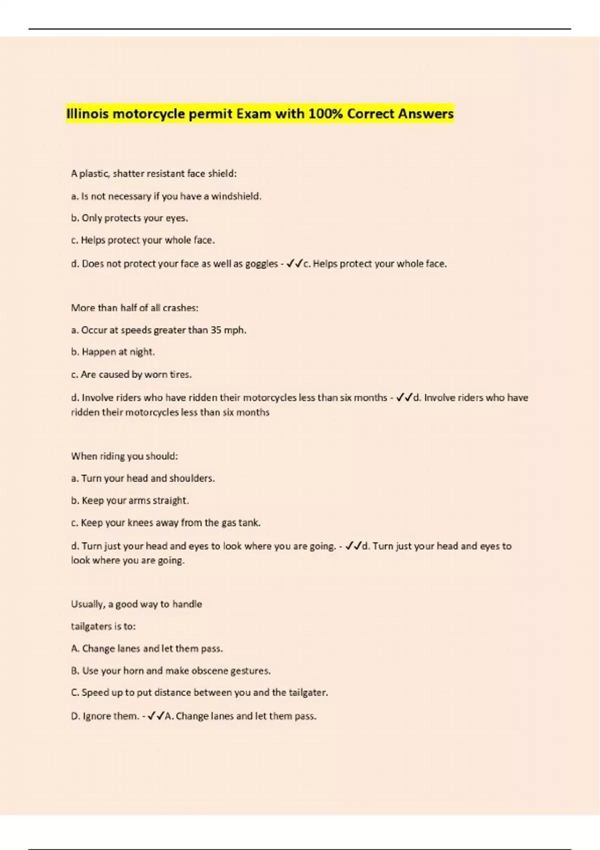 Illinois motorcycle permit Exam with 100% Correct Answer