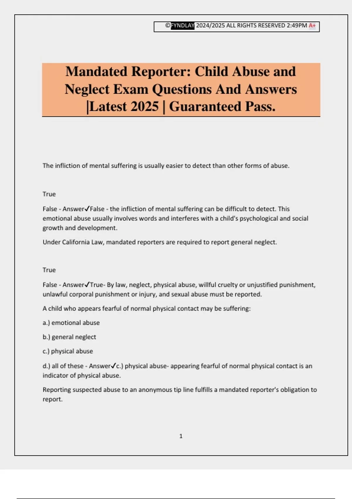 ©FYNDLAY 2024/2025 ALL RIGHTS RESERVED 2:49PM A+ 1 Mandated Reporter: Child Abuse and Neglect Exam Questions And Answers |Latest 2025 | Guaranteed Pass. The infliction of mental suffering is usually easier to detect than other forms of abuse. True False - AnswerFalse - the infliction of mental suffering can be difficult to detect. This emotional abuse usually involves words and interferes with a child's psychological and social growth and development. Under California Law, mandated reporters are required to report general neglect. True False - AnswerTrue- By law, neglect, physical abuse, willful cruelty or unjustified punishment, unlawful corporal punishment or injury, and sexual abuse must be reported. A child who appears fearful of normal physical contact may be suffering: a.) emotional abuse b.) general neglect c.) physical abuse d.) all of these - Answerc.) physical abuse- appearing fearful of normal physical contact is an indicator of physical abuse. Reporting suspected