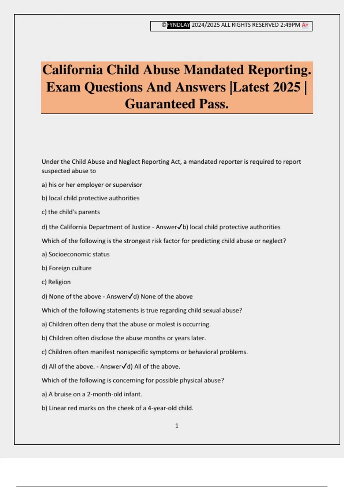 California Child Abuse Mandated Reporting. Exam Questions And Answers |Latest 2025 | Guaranteed Pass.