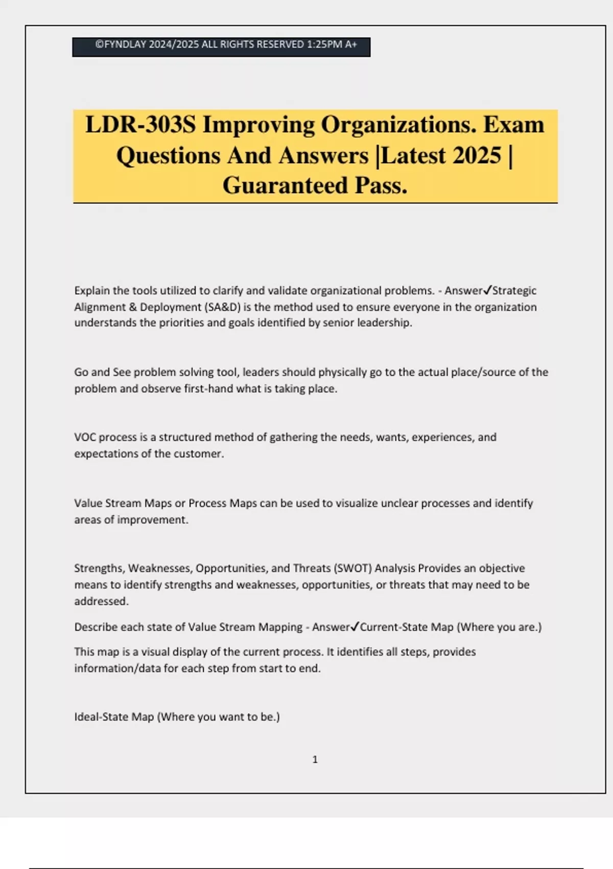©FYNDLAY 2024/2025 ALL RIGHTS RESERVED 1:25PM A+ 1 LDR-303S Improving Organizations. Exam Questions And Answers |Latest 2025 | Guaranteed Pass. Explain the tools utilized to clarify and validate organizational problems. - AnswerStrategic Alignment & Deployment (SA&D) is the method used to ensure everyone in the organization understands the priorities and goals identified by senior leadership. Go and See problem solving tool, leaders should physically go to the actual place/source of the problem and observe first-hand what is taking place. VOC process is a structured method of gathering the needs, wants, experiences, and expectations of the customer. Value Stream Maps or Process Maps can be used to visualize unclear processes and identify areas of improvement. Strengths, Weaknesses, Opportunities, and Threats (SWOT) Analysis Provides an objective means to identify strengths and weaknesses, opportunities, or threats that may need to be addressed. Describe each state of Value Stream Mapping - AnswerCurrent-State Map (Where you are.) This map is a visual display of the current process. It identifies all steps, provides information/data for each step from start to end. Ideal-State Map (Where you want