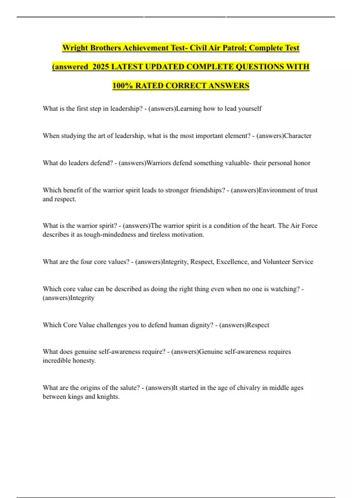 Wright Brothers Achievement Test- Civil Air Patrol; Complete Test (answered_2025 LATEST UPDATED COMPLETE QUESTIONS WITH 100% RATED CORRECT ANSWERS