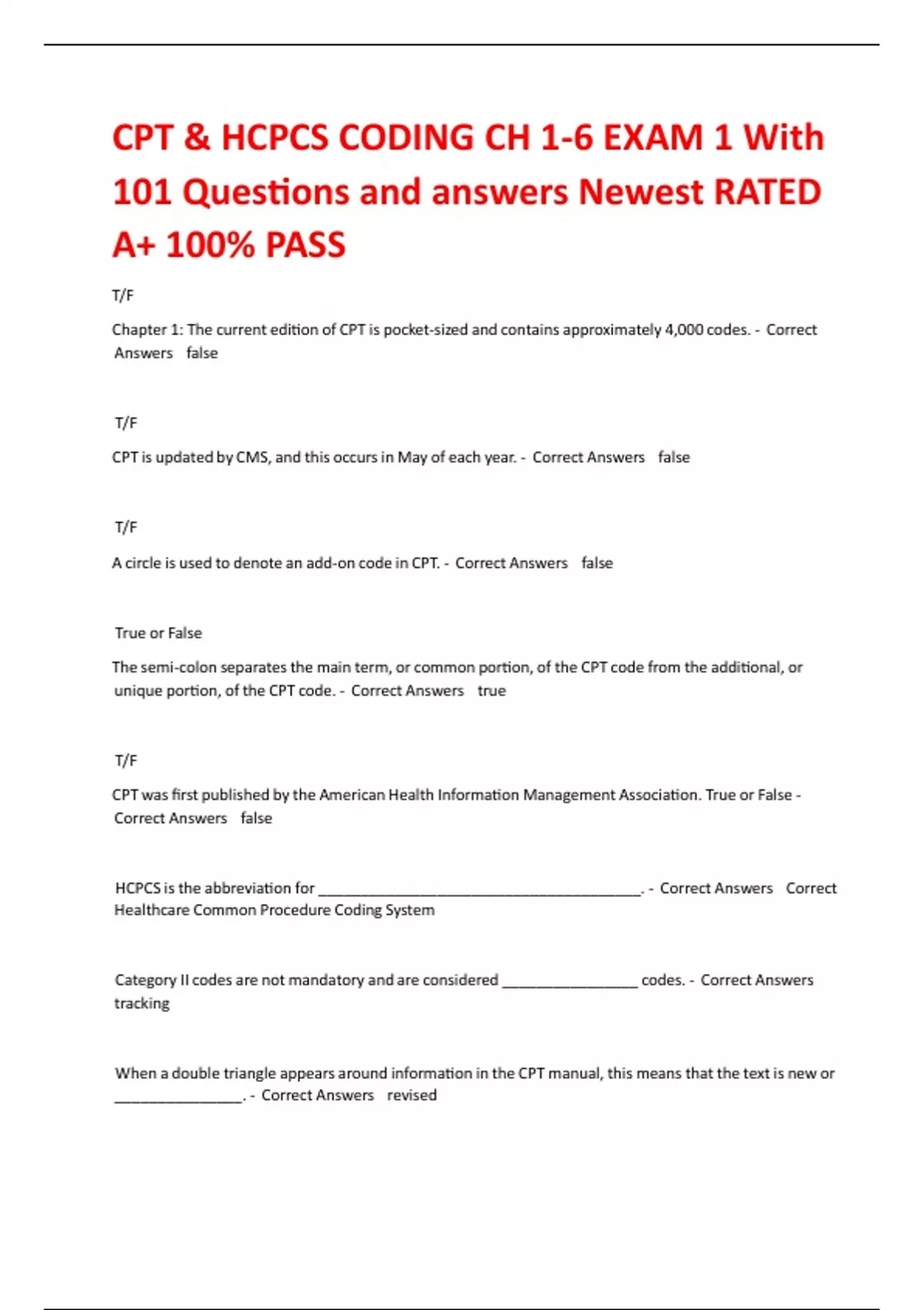 CPT & HCPCS CODING CH 1-6 EXAM 1 With 101 Questions and answers Newest RATED A+ 100% PASS