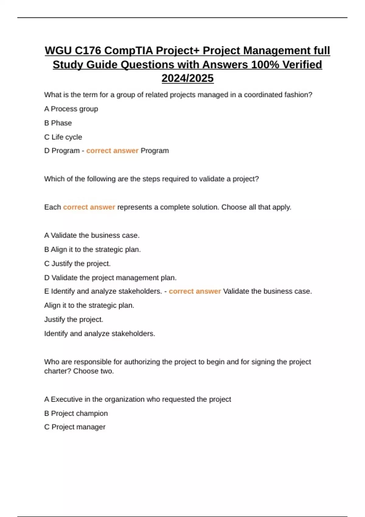 WGU C176 CompTIA Project+ Project Management full Study Guide Questions with Answers 100% Verified 2024/2025 What is the term for a group of related projects managed in a coordinated fashion? A Process group B Phase C Life cycle D Program - correct answer Program Which of the following are the steps required to validate a project? Each correct answer represents a complete solution. Choose all that apply. A Validate the business case. B Align it to the strategic plan. C Justify the project. D Validate the project management plan. E Identify and analyze stakeholders. - correct answer Validate the business case. Align it to the strategic plan. Justify the project. Identify and analyze stakeholders. Who are responsible for authorizing the project to begin and for signing the project charter? Choose two. A Executive in the organization who requested the project B Project champion C Project manager D Project sponsor - correct answer Project champion Project sponsor You're working on a project to develop a client-server application. Your company's collections department will equip their field personnel with wireless tablet PCs that will connect with the server and database. You work for the PMO and are managed by the director of administrative services. The IT department is managed by the director of IT. The telecommunications segments are managed by the director of telecommunications. Who is the project sponsor? A Director of telecommunications B Director of IT C Director of administrative services D Manager of collections E Not enough information - correct answer Not enough information A key responsibility of the project manager includes informing this person of changes, status, conflicts, and issues on the project. A The project coordinator B The project sponsor C The project requestor D The most influential project stakeholder - correct answer The project sponsor Jack is a key stakeholder on the project. He's a big believer in the benefits of the project and provides enthusiasm, energy, communication, and motivation for your project. What is Jack's role? A Project stakeholder B Project champion C Project team member D Business analyst - correct answer Project champion