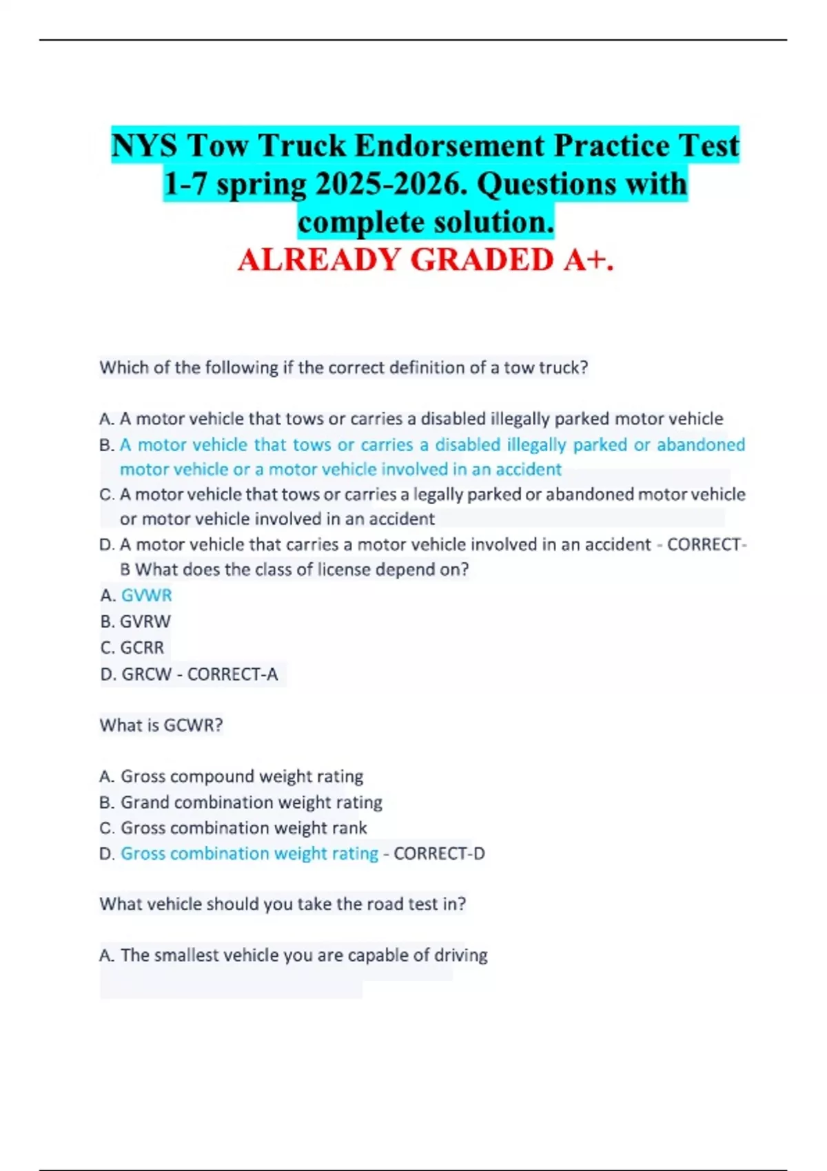 NYS Tow Truck Endorsement Practice Test 1-7 spring . Questions with complete solution. ALREADY GRADED A+. Which of the following if the correct definition of a tow truck? A. A motor vehicle that tows or carries a disabled illegally parked motor vehicle B. A motor vehicle that tows or carries a disabled illegally parked or abandoned motor vehicle or a motor vehicle involved in an accident C. A motor vehicle that tows or carries a legally parked or abandoned motor vehicle or motor vehicle involved in an accident D. A motor vehicle that carries a motor vehicle involved in an accident - CORRECT-B What does the class of license depend on? A. GVWR B. GVRW C. GCRR D. GRCW - CORRECT-A What is GCWR? A. Gross compound weight rating B. Grand combination weight rating C. Gross combination weight rank D. Gross combination weight rating - CORRECT-D What vehicle should you take the road test in? A. The smallest vehicle you are capable of driving B. The largest vehicle you are capable of driving C. A midsize vehicle - CORRECT-B Is a HazMat endorsement required to tow a truck carrying hazardous materials? A. Yes, always B. No, exceptions can be made under emergency conditions C. No, exceptions can be made if moving the disabled vehicle less than 50 miles D. No, exceptions can be made if moving the disabled vehicle more than 50 miles - CORRECT-B How are tow trucks generally classified? A. By mass and color B. By weight and volume C. By weight and body type D. By body type and mass - CORRECT-C What is the GVWR of medium duty tow trucks? A. 10,001-26,000 pounds B. 8,600-10,000 pounds C. 11,000-25,000 pounds D. Over 26,000 pounds - CORRECT-A What is the correct definition of a car carrier? A. Designed to transport 2-3 motor vehicles on a slanted platform that slides or tilts to the ground to facilitate the loading and unloading of vehicles B. Designed to transport 1-3 motor vehicles on a flat platform that is stationary to facilitate the loading and unloading of vehicles C. Designed to transport 2-3 motor vehicles on a flat platform that is stationary to facilitate the loading and unloading of vehicles D. Designed to transport 1-3 motor vehicles on a flat platform that slides or tilts to the ground to facilitate the loading and unloading of vehicles - CORRECT-D What is the most common cause of death and injury to tow truck operators in an accident? A. Distracted driving B. Drunk driving C. Equipment failure D. Weather - CORRECT-C Your ability to tow properly and safely is limited by A. The weakest component on your tow truck B. The strongest component on your tow truck C. The smallest component on your tow truck D. The largest component on your tow truck - CORRECT-A If a truck has a front axle weight limit rating of 9,000 pounds, rear axle weight limit of 18,500 pounds, a curb weight of 17,000 pounds with 7,000 pounds on the front axles and 10,000 pounds on the rear axles, how much will the rear axles be able to lift? A. 7,500 pounds B. 8,000 pounds C. 9,000 pounds D. 8,500 pounds - CORRECT-D Is the following statement true or false?: The safe towing capacity (STC) of a tow truck is considerably less than its GAWR A. True B. False - CORRECT-A What is the distance from the rear axles to the end of the tow truck known as? A. Rear gap B. Tow Gap C. Overhang D. Under hang - CORRECT-C Safe towing capacity (STC) does not cause more than what percent loss of the original unloaded front axle weight (FAW)? A. 20% B. 50% C. 75% D. 60% - CORRECT-B What is the correct formula to calculate the safe towing capacity? A. (FAW x OH / WB) / 2 = STC B. (OH x WB / FAW) / 2 = STC C. (FAW x WB / OH) / 2 = STC D. (FAW x WB / OH) / 4 = STC - CORRECT-C What is the maximum weight or load that new equipment can bear under ideal lab conditions without being damaged? A. Working Load Limit B. Breaking Strength Rating - CORRECT-B Complete the phrase: Use the proper equipment. Don't take shortcuts. A. Take your time and be safe B. Be efficient and safe C. Be quick and efficient D. Be steady and safe - CORRECT-A