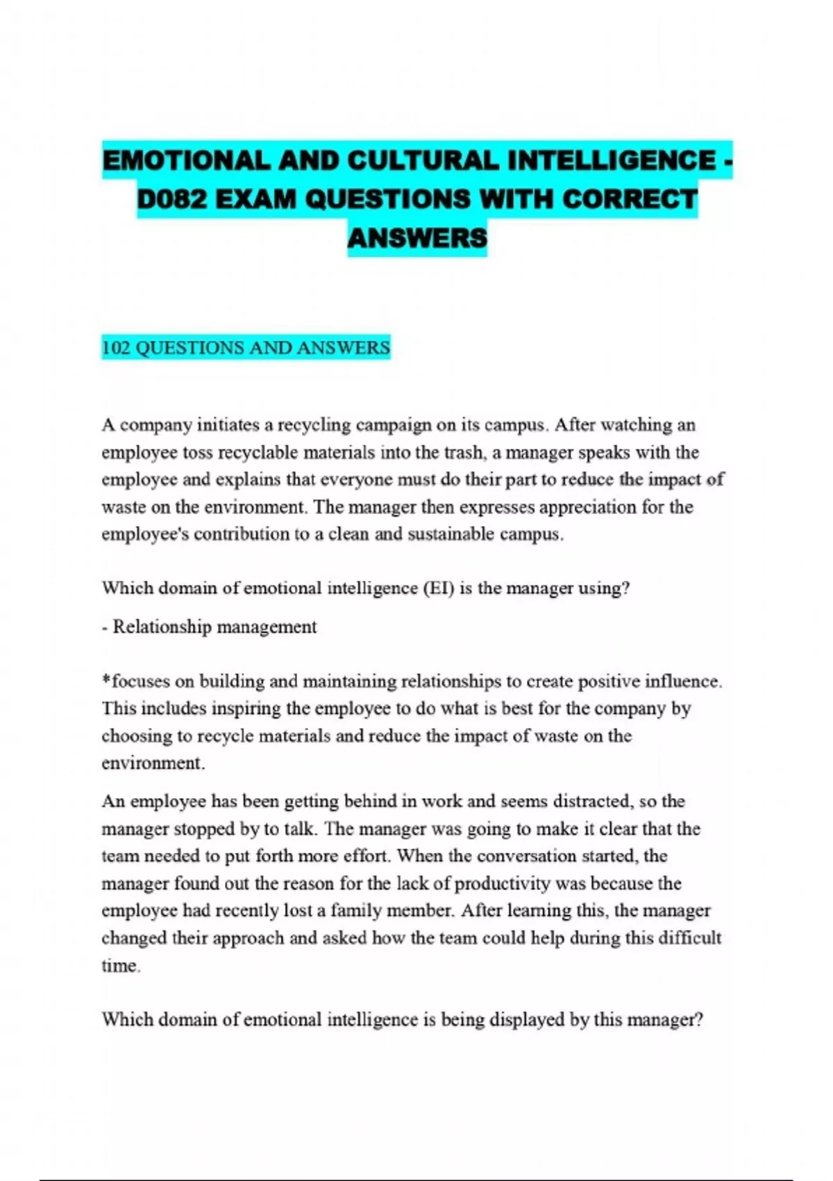 EMOTIONAL AND CULTURAL INTELLIGENCE -D082 EXAM QUESTIONS WITH CORRECT ANSWERS....
