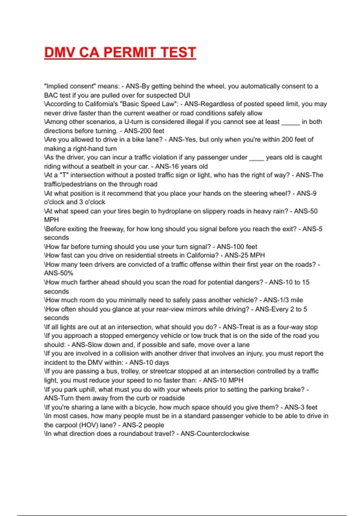 DMV CA PERMIT TEST EXAM 2025/2026 QUESTIONS WITH VERIFIED SOLUTIONS.
