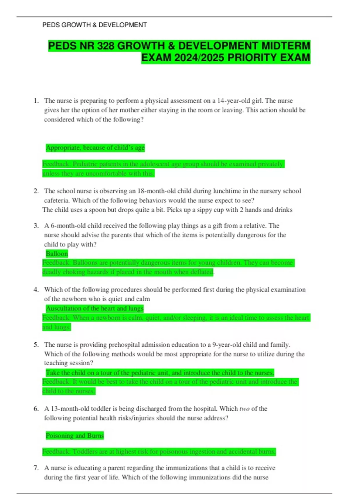 PEDS NR 328 GROWTH & DEVELOPMENT MIDTERM EXAM 2024/2025 PRIORITY EXAM