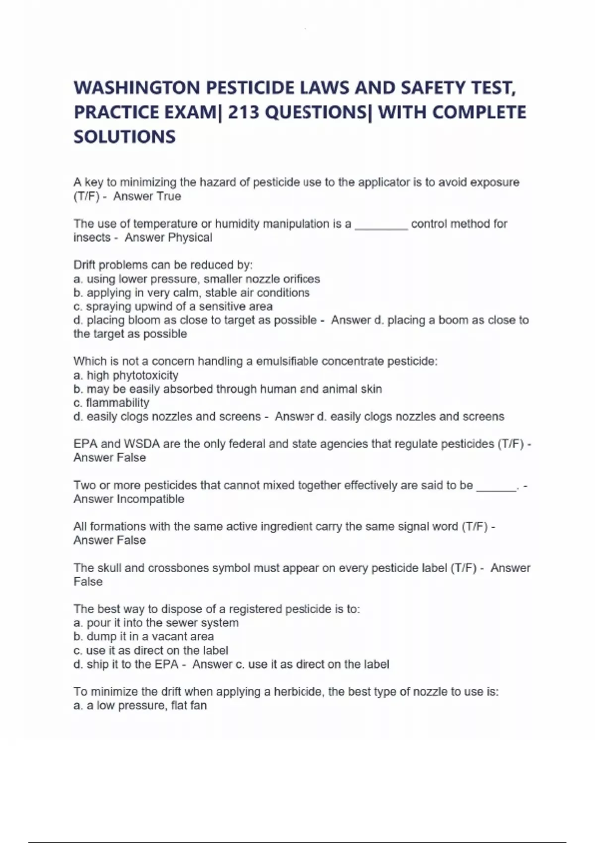 WASHINGTON PESTICIDE LAWS AND SAFETY TEST, PRACTICE EXAM| 213 QUESTIONS| WITH COMPLETE SOLUTIONS A key to minimizing the hazard of pesticide use to the applicator is to avoid exposure (T/F) - Answer True The use of temperature or humidity manipulation is a ________ control method for insects - Answer Physical Drift problems can be reduced by: a. using lower pressure, smaller nozzle orifices b. applying in very calm, stable air conditions c. spraying upwind of a sensitive area d. placing bloom as close to target as possible - Answer d. placing a boom as close to the target as possible Which is not a concern handling a emulsifiable concentrate pesticide: a. high phytotoxicity b. may be easily absorbed through human and animal skin c. flammability d. easily clogs nozzles and screens - Answer d. easily clogs nozzles and screens EPA and WSDA are the only federal and state agencies that regulate pesticides (T/F) - Answer False Two or more pesticides that cannot mixed together effectively are said to be ______. - Answer Incompatible All formations with the same active ingredient carry the same signal word (T/F) - Answer False The skull and crossbones symbol must appear on every pesticide label (T/F) - Answer False The best way to dispose of a registered pesticide is to: a. pour it into the sewer system b. dump it in a vacant area c. use it as direct on the label d. ship it to the EPA - Answer c. use it as direct on the label To minimize the drift when applying a herbicide, the best type of nozzle to use is: a. a low pressure, flat fan b. off center c. a high pressure cone d. makes no difference - Answer a. a low pressure, flat fan Which LD50 is a representative of a highly toxic pesticide: a. 640 mg/kg b. 5,800 mg/kg c. 12,840 mg/kg d. 46 mg/kg - Answer d.