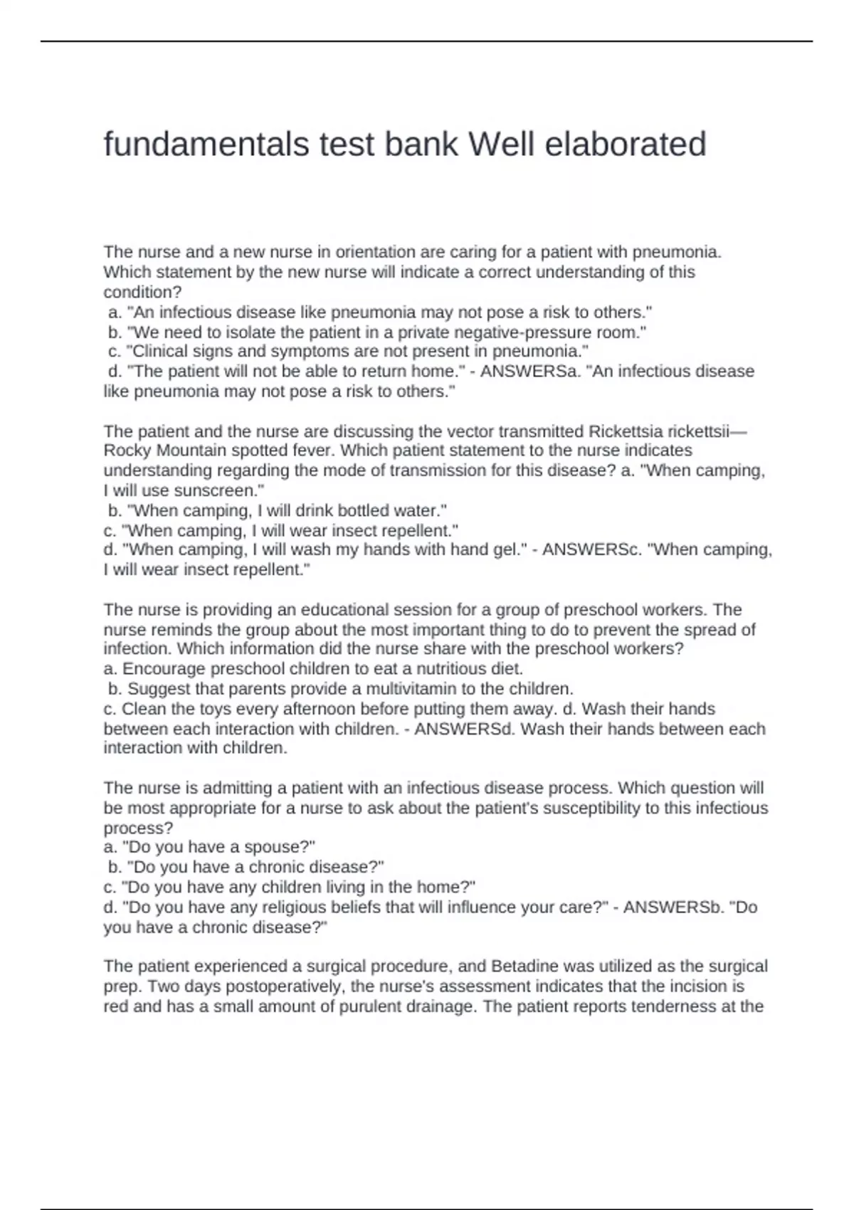 The nurse and a new nurse in orientation are caring for a patient with pneumonia. Which statement by the new nurse will indicate a correct understanding of this condition? a. "An infectious disease like pneumonia may not pose a risk to others." b. "We need to isolate the patient in a private negative-pressure room." c. "Clinical signs and symptoms are not present in pneumonia." d. "The patient will not be able to return home." - ANSWERSa. "An infectious disease like pneumonia may not pose a risk to others." The patient and the nurse are discussing the vector transmitted Rickettsia rickettsii—Rocky Mountain spotted fever. Which patient statement to the nurse indicates understanding regarding the mode of transmission for this disease? a. "When camping, I will use sunscreen." b. "When camping, I will drink bottled water." c. "When camping, I will wear insect repellent." d. "When camping, I will wash my hands with hand gel." - ANSWERSc. "When camping, I will wear insect repellent." The nurse is providing an educational session for a group of preschool workers. The nurse reminds the group about the most important thing to do to prevent the spread of infection. Which information did the nurse share with the preschool workers? a. Encourage preschool children to eat a nutritious diet. b. Suggest that parents provide a multivitamin to the children. c. Clean the toys every afternoon before putting them away. d. Wash their hands between each interaction with children. - ANSWERSd. Wash their hands between each interaction with children. The nurse is admitting a patient with an infectious disease process. Which question will be most appropriate for a nurse to ask about the patient's susceptibility to this infectious process? a. "Do you have a spouse?" b. "Do you have a chronic disease?" c. "Do you have any children living in the home?" d. "Do you have any religious beliefs that will influence your care?" - ANSWERSb. "Do you have a chronic disease?" The patient experienced a surgical procedure, and Betadine was utilized as the surgical prep. Two days postoperatively, the nurse's assessment indicates that the incision is red and has a small amount of purulent drainage. The patient reports tenderness at the incision site. The patient's temperature is 100.5° F, and the WBC is 10,500/mm3. Which action should the nurse take first? a. Plan to change the surgical dressing during the shift. b. Utilize SBAR to notify the primary health care provider. c. Reevaluate the temperature and white blood cell count in 4 hours. d. Check to see what solution was used for skin preparation in surgery. - ANSWERSb. Utilize SBAR to notify the primary health care provider. The nurse is providing an education session to an adult community group about the effects of smoking on infection. Which information is most important for the nurse to include in the educational session? a. Smoke from tobacco products clings to your clothing and hair. b. Smoking affects the cilia lining the upper airways in the lungs. c. Smoking can affect the color of the patient's fingernails. d. Smoking tobacco products can be very expensive. - ANSWERSb. Smoking affects the cilia lining the upper airways in the lungs. A female adult patient presents to the clinic with reports of a white discharge and itching in the vaginal area. A nurse is taking a health history. Which question is the priority? a. "When was the last time you visited your primary health care provider?" b. "Has this condition affected your eating habits in any way?" c. "What medications are you currently taking?" d. "Are you able to sleep at night? - ANSWERSc. "What medications are you currently taking?" The nurse is caring for a school-aged child who has injured the right leg after a bicycle accident. Which signs and symptoms will the nurse assess for to determine if the child is experiencing a localized inflammatory response? a. Malaise, anorexia, enlarged lymph nodes, and increased white blood cells b. Chest pain, shortness of breath, and nausea and vomiting c. Dizziness and disorientation to time, date, and place d. Edema, redness, tenderness, and loss of function - ANSWERSd. Edema, redness, tenderness, and loss of function Which interventions utilized by the nurse will indicate the ability to recognize a localized inflammatory response? a. Vigorous range-of-motion exercises b. Turn, cough, and deep breathe c. Orient to date, time, and place d. Rest, ice, and elevation - ANSWERSd. Rest, ice, and elevation The nurse is caring for a group of medical-surgical patients. Which patient is most at risk for developing an infection? a. A patient who is in observation for chest pain. b. A patient who has been admitted with dehydration. c. A patient who is recovering from a right total hip surgery. d. A patient who has been admitted for stabilization of heart problems. - ANSWERSc. A patient who is recovering from a right total hip surgery. The nurse is caring for a patient diagnosed with leukemia and is preparing to provide fluids through a vascular access (IV) device. Which nursing intervention is a priority in this procedure? a. Review the procedure with the patient. b. Position the patient comfortably. c. Maintain surgical aseptic technique. d. Gather available supplies. - ANSWERSc. Maintain surgical aseptic technique. The nurse is caring for an adult patient in the clinic who has been evacuated and is a victim of flooding. The nurse teaches the patient about rest, exercise, and eating properly and how to utilize deep breathing and visualization. What is the primary rationale for the nurse's actions related to the teaching? a. Topics taught are standard information taught during health care visits. b. The patient requested this information to teach the extended family members. c. Stress for long periods of time can lead to exhaustion and decreased resistance to infection. d. These techniques will help the patient manage the pain and loss of personal belongings. - ANSWERSc. Stress for long p