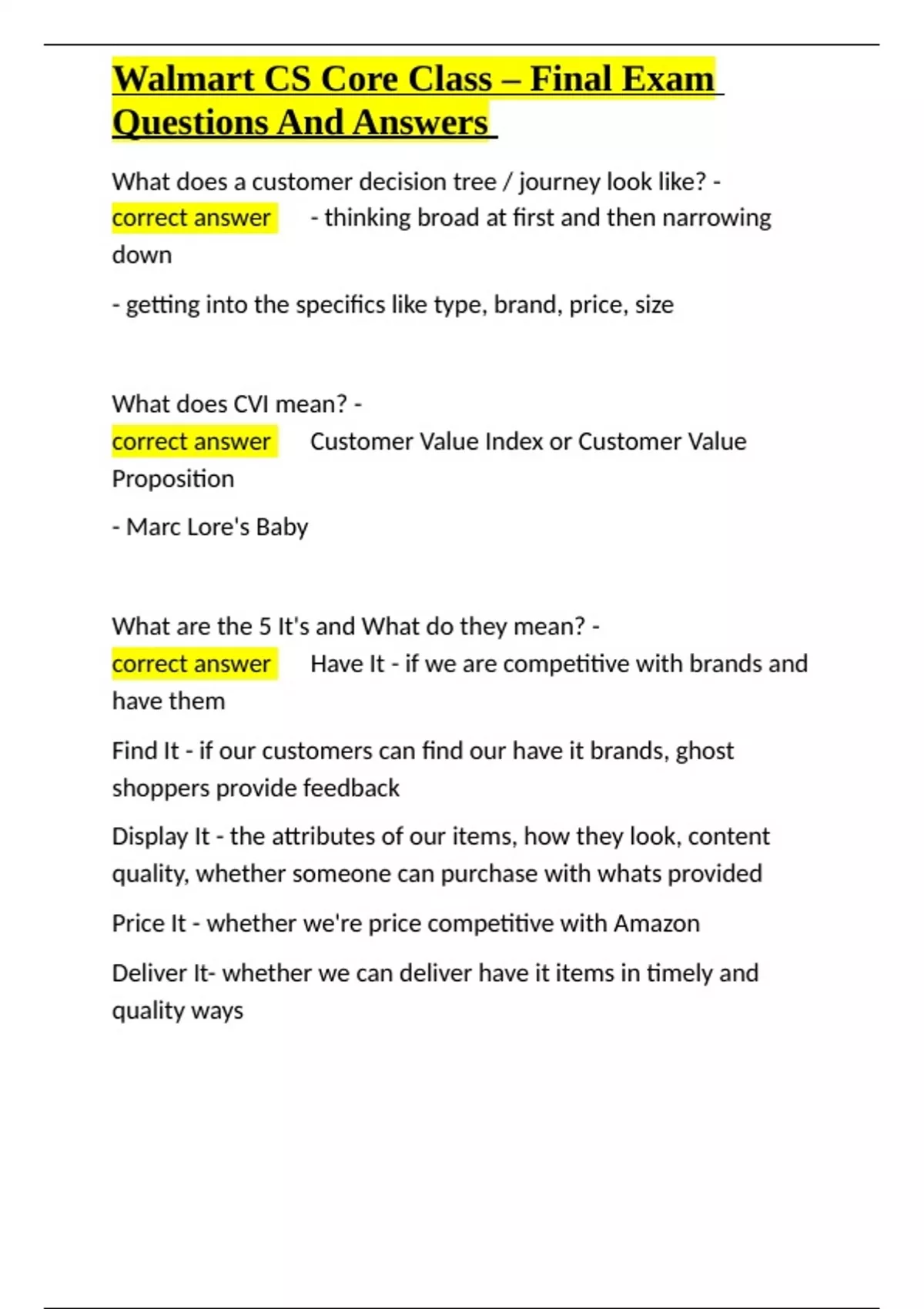 Walmart CS Core Class – Final Exam Questions And A