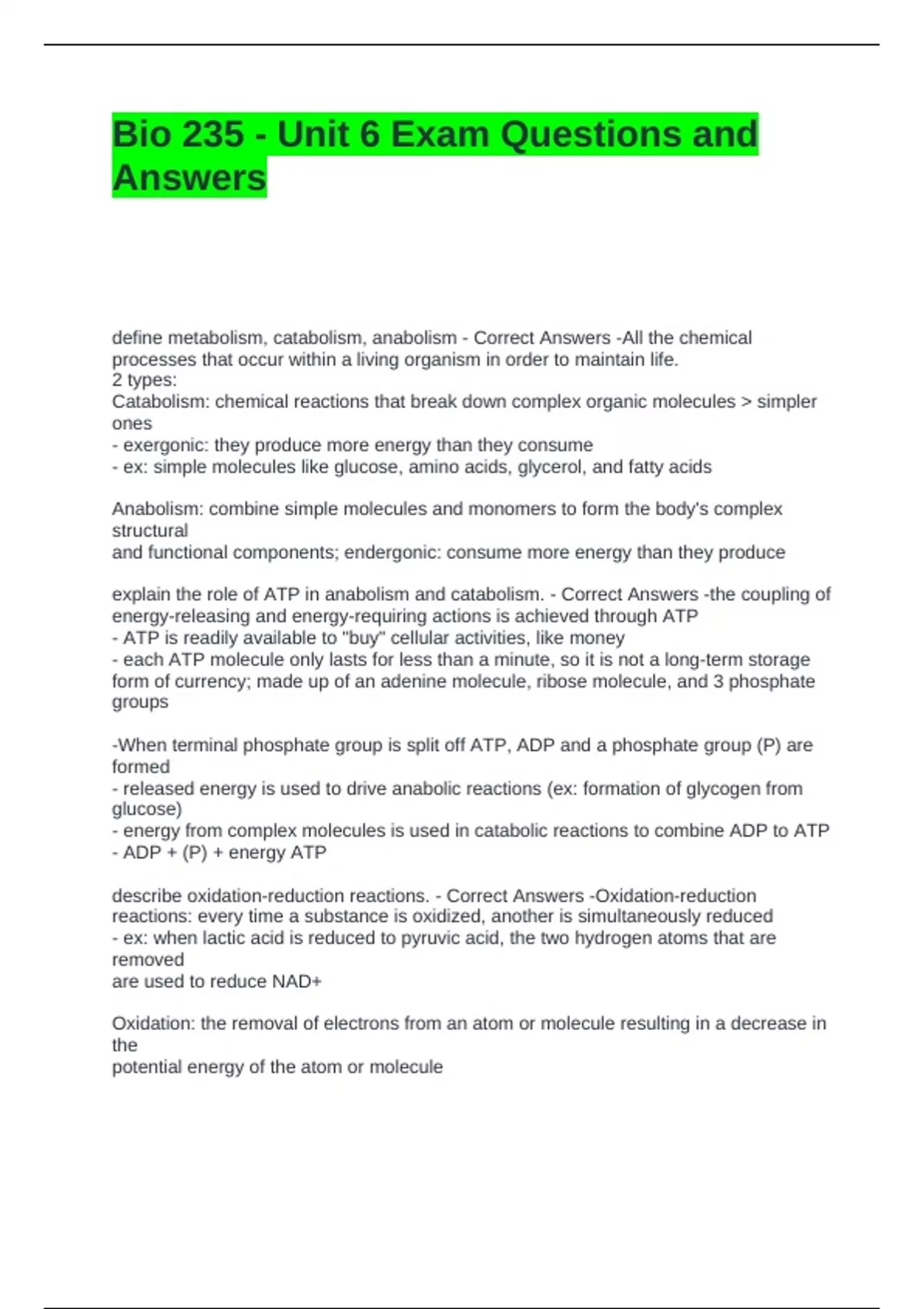 Bio 235 - Unit 6 Exam Questions and Answers