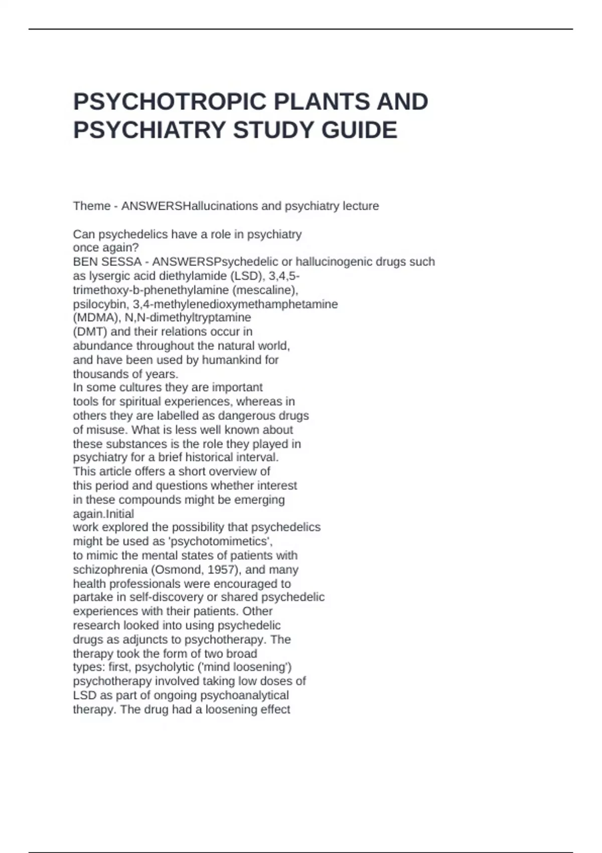 PSYCHOTROPIC PLANTS AND PSYCHIATRY STUDY GUIDE