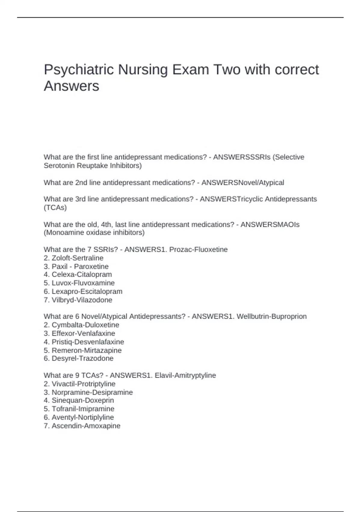 What are the first line antidepressant medications? - ANSWERSSSRIs (Selective Serotonin Reuptake Inhibitors) What are 2nd line antidepressant medications? - ANSWERSNovel/Atypical What are 3rd line antidepressant medications? - ANSWERSTricyclic Antidepressants (TCAs) What are the old, 4th, last line antidepressant medications? - ANSWERSMAOIs (Monoamine oxidase inhibitors) What are the 7 SSRIs? - ANSWERS1. Prozac-Fluoxetine 2. Zoloft-Sertraline 3. Paxil - Paroxetine 4. Celexa-Citalopram 5. Luvox-Fluvoxamine 6. Lexapro-Escitalopram 7. Vilbryd-Vilazodone What are 6 Novel/Atypical Antidepressants? - ANSWERS1. Wellbutrin-Buproprion 2. Cymbalta-Duloxetine 3. Effexor-Venlafaxine 4. Pristiq-Desvenlafaxine 5. Remeron-Mirtazapine 6. Desyrel-Trazodone What are 9 TCAs? - ANSWERS1. Elavil-Amitryptyline 2. Vivactil-Protriptyline 3. Norpramine-Desipramine 4. Sinequan-Doxeprin 5. Tofranil-Imipramine 6. Aventyl-Nortiplyline 7. Ascendin-Amoxapine 8. Anafranil-Comipramine 9. Ludiomil-Maprotiline What are 7 Side Effects of SSRIs? - ANSWERS1. Agitation 2. Anxiety 3. Insomnia (Prozac) 4. Sexual dysfunction 5. Weight Gain 6. Sedation 7. Tremor What are the 6 Side Effects of TCAs? - ANSWERS1. Anticholinergic 2. Postural Hypotension 3. Sedation 4. Weight Gain 5. Sexual Dysfunction 6. CV- LETHAL IN OD What foods must you avoid when taking MAOIs to avoid hypertensive crisis? - ANSWERSFoods with Tyramine What are 8 Mood Stabilizer medications? - ANSWERS1. Tegretol-Carbamazepine 2. Depakote-Valproate Acid 3. Divalproex Sodium 4. Neurontin-Gabapentin 5. Lamictal-Lamotrigine 6. Topamax-Topiramate 7. Trileptal-Oxcarbazepine 8. Keppra-Levetiracetam What are Therapeutic Lithium Levels - ANSWERS.8-1.4 What are Maintenance Lithium Levels? - ANSWERS.4-1.3 What is the major dangerous side effect of Mood Stabilizers? - ANSWERSAgranulocytosis What are the 5 Side Effects of Lithium? - ANSWERS1. Fine Hand Tremors 2. Mild Nausea 3. Weight Gain 4. Polyuria 5. Thirst What are 9 signs of Lithium Toxicity? - ANSWERS1. N&V 2. Diarrhea 3. Slurred Speech 4. Ataxia 5. Shaking Hands 6. Muscle Twitching 7. HeadAche 8. Lethargy 9. Coma When should you HOLD THE LITHIUM? - ANSWERSWHEN SERUM LITHIUM LEVEL IS OVER 1.5 What are 4 Standard/Traditional Antipsychotic Medications? - ANSWERS1. Thorazine-Chlorpromazine 2. Haldol-Haloperidol 3. Prolixin-Fluphenazine 4. Navane-Thiothixene What are 2 Long Acting IM AntiPsychotic Injectable Decanoate Medications? - ANSWERS1. Prolixin 2. Haldol What are 11 Atypical/Novel Antipsychotic/Neuroleptic Drugs? - ANSWERS1. Risperdal-Resperidone 2. Risperdal M tabs 3. Zyprexa-Olanzapine 4. Zydis wafer- Quick dissolving 5. Seroquel-Quetiapine 6. Geodon-Ziprasidone 7. Abilify-Aripiprazole 8. Invega-Paliperidone 9. Saphris-Asenapine 10. Fanapt-Iloperidone 11. Latuda-Lurasidone What are 2 Long-Acting Atypical/Novel Antipsychotic/Neuroleptic Drugs? - ANSWERS1. Risperdal Consta 2. Invega Sustenna What are 4 Side Effects of Antipsychotic/Neuroleptic Drugs? - ANSWERS1. Weight Gain 2. Less EPS than traditional neuroleptics 3. High Blood Sugar 4. High Lipids What is the dangerous Antipsychotic that is the drug of last resort? - ANSWERSClozaril What are the lab values to check for Clozaril? - ANSWERS1. WBC Count 2. Absolute Neutrophil Count What is the most dangerous Clozaril Side Effect? - ANSWERSAgranulocytosis What are the 4 Side Effects of Clozaril? - ANSWERS1. Agranulocytosis 2. Seizures 3. Bedwetting 4. Excessive Salivation What are the 4 Extrapyramidal Symptoms that can occur when taking AntiPsychotic Medicatons? - ANSWERS1. Dystonia -muscle cramps of the head and neck 2. Akathisia- internal and external restlessness 3. Pseudoparkinsonism- tremors, rigidity, drooling, mask-like face, shuffling gait. 4. Tardive Dyskinesia (TD) - involuntary muscle spasms involving tongue, fingers, toes neck and trunk, lip smacking. Is Tardive Dyskinesia associated with long term or short term use of antipsychotics? - ANSWERSLong Term Use What are 6 medications (Antiparkinson Agents) used to treat EPS (but not TD)? - ANSWERS1. Artane-Trihexyphenide 2. Cogentin-Benztropine 3. Akineton-Biperiden 4. Benadryl-Diphenhydramine 5. Kemadrin-Procyclidine 6. Parlodel-Bromocriptine Schizophrenia is best characterized as a. split personality. b. multiple personalities. c. ambivalent personality. d. deteriorating personality. - ANSWERSd. deteriorating personality. The course of the disease is marked by recurrent acute exacerbations. With each relapse of psychosis, an increase in residual dysfunction and deterioration occurs. A descriptor for a subtype of schizophrenia is a. delusional. b. dissociated. c. disorganized. d. developmental. - ANSWERSc. disorganized. Disorganized schizophrenia is a subtype of schizophrenia listed in the DSM-IV-TR and refers to the most regressed and socially impaired of all the schizophrenic disorders. Which of the following would be assessed as a negative symptom of schizophrenia? a. Anhedonia b. Hostility c. Agitation d. Hallucinations - ANSWERSa. Anhedonia Negative symptoms include the crippling symptoms of affective blunting, anergia, anhedonia avolition, poverty of content of speech, poverty of speech, and thought blocking. The type of altered perception most commonly experienced by clients with schizophrenia is a. delusions. b. illusions. c. tactile hallucinations. d. auditory hallucinations. - ANSWERSd. auditory hallucinations. Hallucinations, especially auditory hallucinations, are the major example of alterations of perception in schizophrenia. They are experienced by as many as 90% of schizophrenic individuals. What is the most common course of schizophrenia? Initial episode followed by a. recurrent acute exacerbations and deterioration. b. recurrent acute exacerbations. c. continuous deterioration. d, complete recovery. - ANSWERSa. recurrent acute exacerbations and deterioration. Schizophrenia is usually a disorder marked by an initial episode followed by recurrent acute exacerbations. With each relapse of psycho